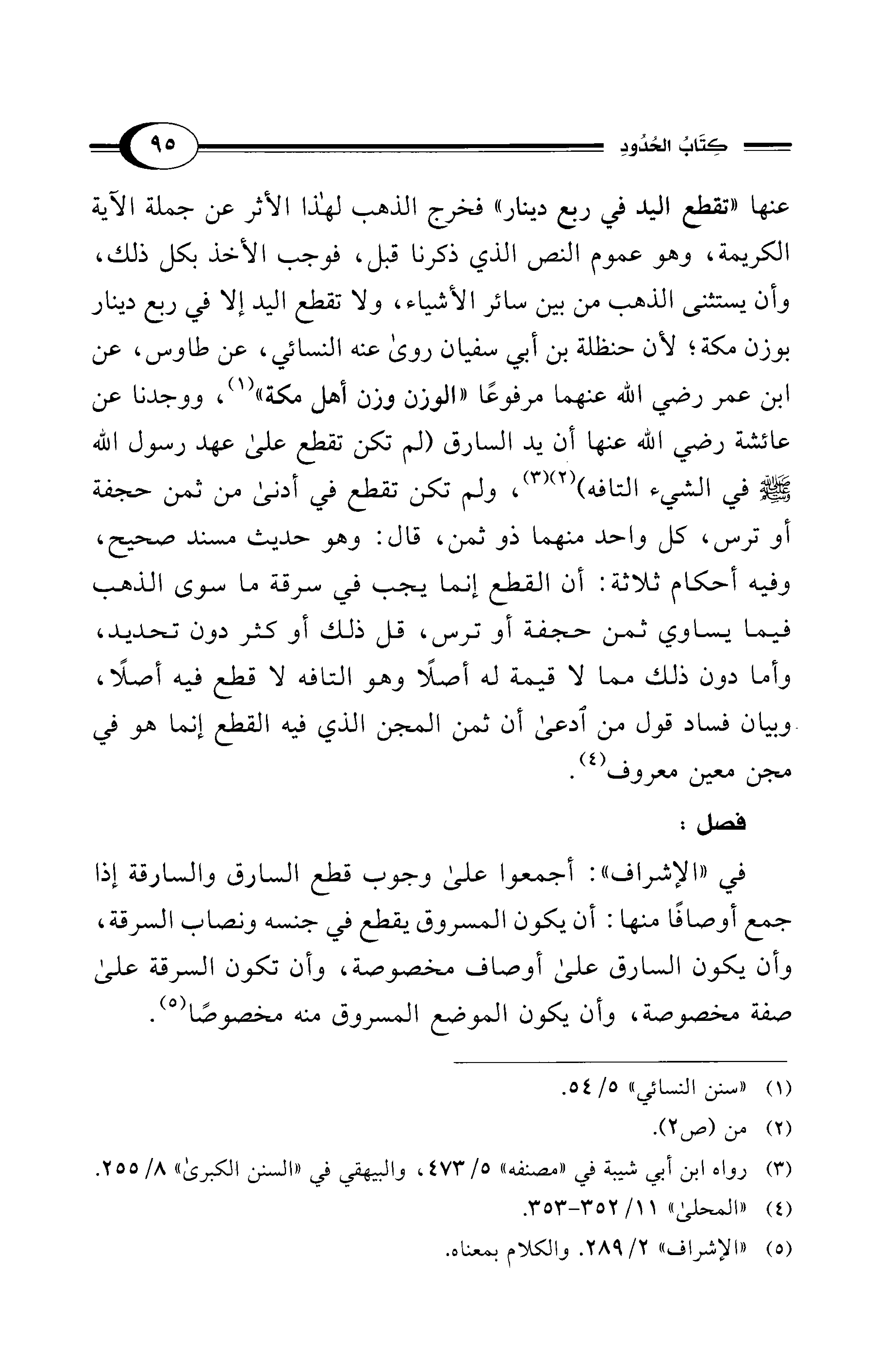 عنها "تقطع اليد في ربع دينار" فخرج الذهب لهذا الأثر عن جملة الآية الكريمة، وهو عموم النص الذي ذكرنا قبل، فوجب الأخذ بكل ذلك، وأن يستثنى الذهب من بين سائر الأشياء، ولا تقطع اليد إلا في ربع دينار بوزن مكة؛ لأن حنظلة بن أبي سفيان روى عنه النسائي، عن طاوس، عن ابن عمر - رضي الله عنهما - مرفوعًا "الوزن وزن أهل مكة" (¬1)، ووجدنا عن عائشة - رضي الله عنها - أن يد السارق (لم تكن تقطع على عهد رسول الله - صلى الله عليه وسلم - في الشيء التافه) (¬2) (¬3)، ولم تكن تقطع في أدنى من ثمن حجفة أو ترس، كل واحد منهما ذو ثمن، قال: وهو حديث مسند صحيح، وفيه أحكام ثلاثة: أن القطع إنما يجب في سرقة ما سوى الذهب فيما يساوي ثمن حجفة أو ترس، قل ذلك أو كثر دون تحديد، وأما دون ذلك بما لا قيمة له أصلاً وهو التافه لا قطع فيه أصلاً،
