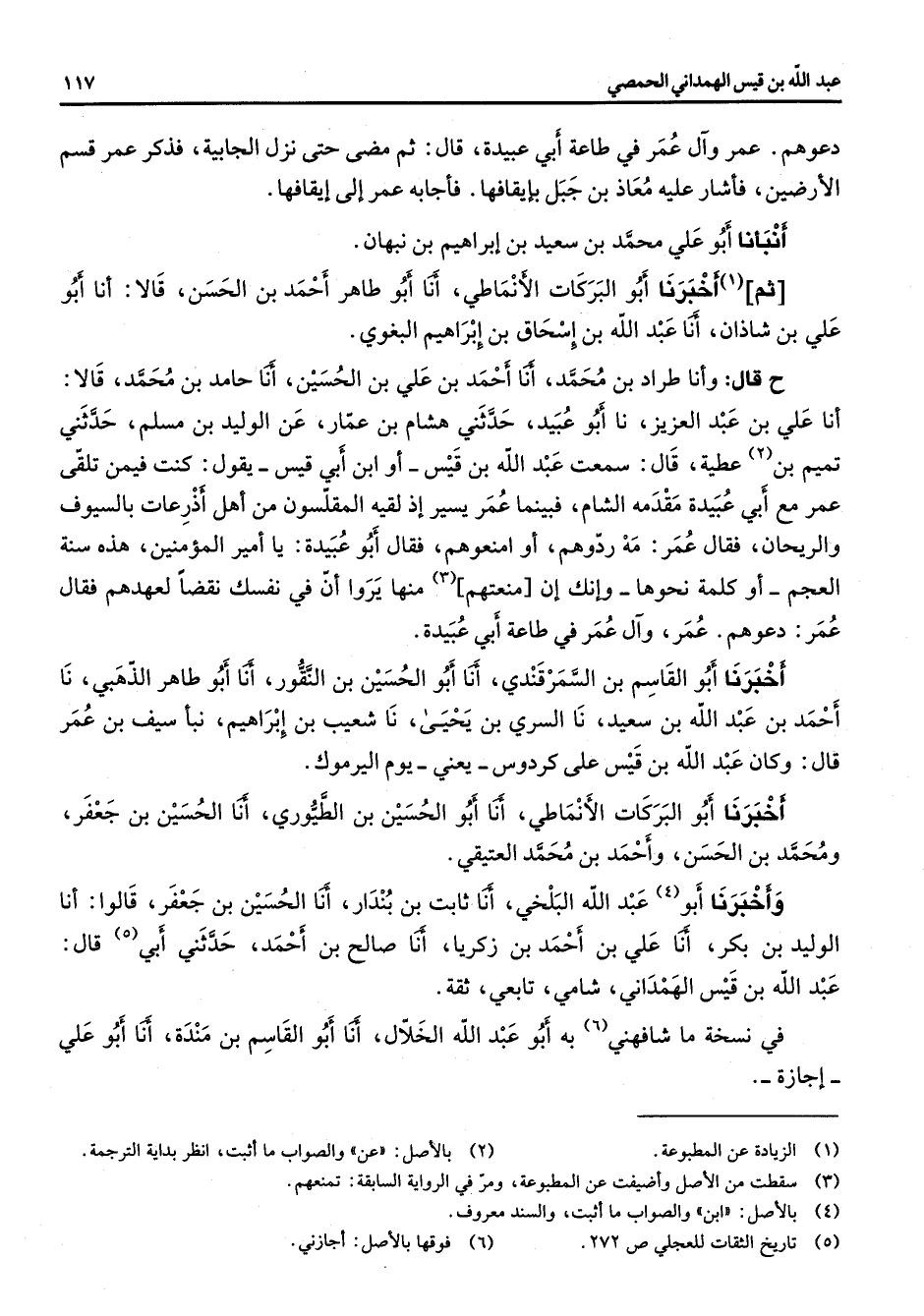 دعوهم عمر وآل عمر في طاعة أبي عبيدة قال ثم مضى حتى نزل الجابية فذكر عمر قسم الأرضيين فأشار عليه معاذ بن جبل بإيقافها فاجابه عمر إلى ايقافها أنبأنا أبو علي محمد بن سعيد بن إبراهيم بن نبهان ثم (1) أخبرنا أبو البركات الانماطي أنا أبو طاهر احمد بن الحسن قالا أنا أبو علي بن شاذان أنا عبد الله بن إسحاق بن إبراهيم البغوي ح قال وأنا طراد بن محمد أنا احمد بن علي بن الحسين أنا حامد بن محمد قالا أنا علي بن عبد العزيز نا أبو عبيد حدثني هشام بن عمار عن الوليد بن مسلم حدثني تميم بن (2) عطية قال سمعت عبد الله بن قيس أو ابن أبي قس يقول كنت فيمن تلقى عمر مع أبو عبيدة مقدمه الشام فبينما عمر يسير إذ لقيه المقلسون من أهل اذرعات بالسيوف والريحان فقال عمر مه ردوهم أو امنعوعهم فقال أبو عبيدة يا أمير المؤمنين هذه سنة العجم أو كلمة نحوها وانك إن منعتهم (3) منها يروا أن في نفسك نقضا لعهدهم فقال عمر دعوهم عمر وآل عمر في طاعة أبي عبيدة أخبرنا أبو القاسم بن السمرقندي أنا أبو الحسين بن النقور أنا أبو طاهر الذهبي نا أحمد بن عبد الله بن سعيد نا السري بن يحيى نا شعيب بن إبراهيم نبأ سيف بن عمر قال وكان عبد الله بن قيس على كردوس يعني يوم اليرموك أخبرنا أبو (4) البركات الأنماطي أنا أبو الحسين بن الطيوري أنا الحسين بن جعفر ومحمد بن الحسن واحمد بن محمد العتيقي وأخبرنا أبو عبد الله البلخي أنا ثابت بن بندار أنا الحسين بن جعفر قالوا أنا الوليد بن بكر أنا علي بن احمد بن زكريا أنا صالح بن احمد حدثني أبي (5) قال عبد الله بن قيس الهمداني شامي تابعي ثقة في نسخة ما شافهني (6) به أبو عبد الله الخلال أنا أبو القاسم بن مندة أنا أبو علي إجازة