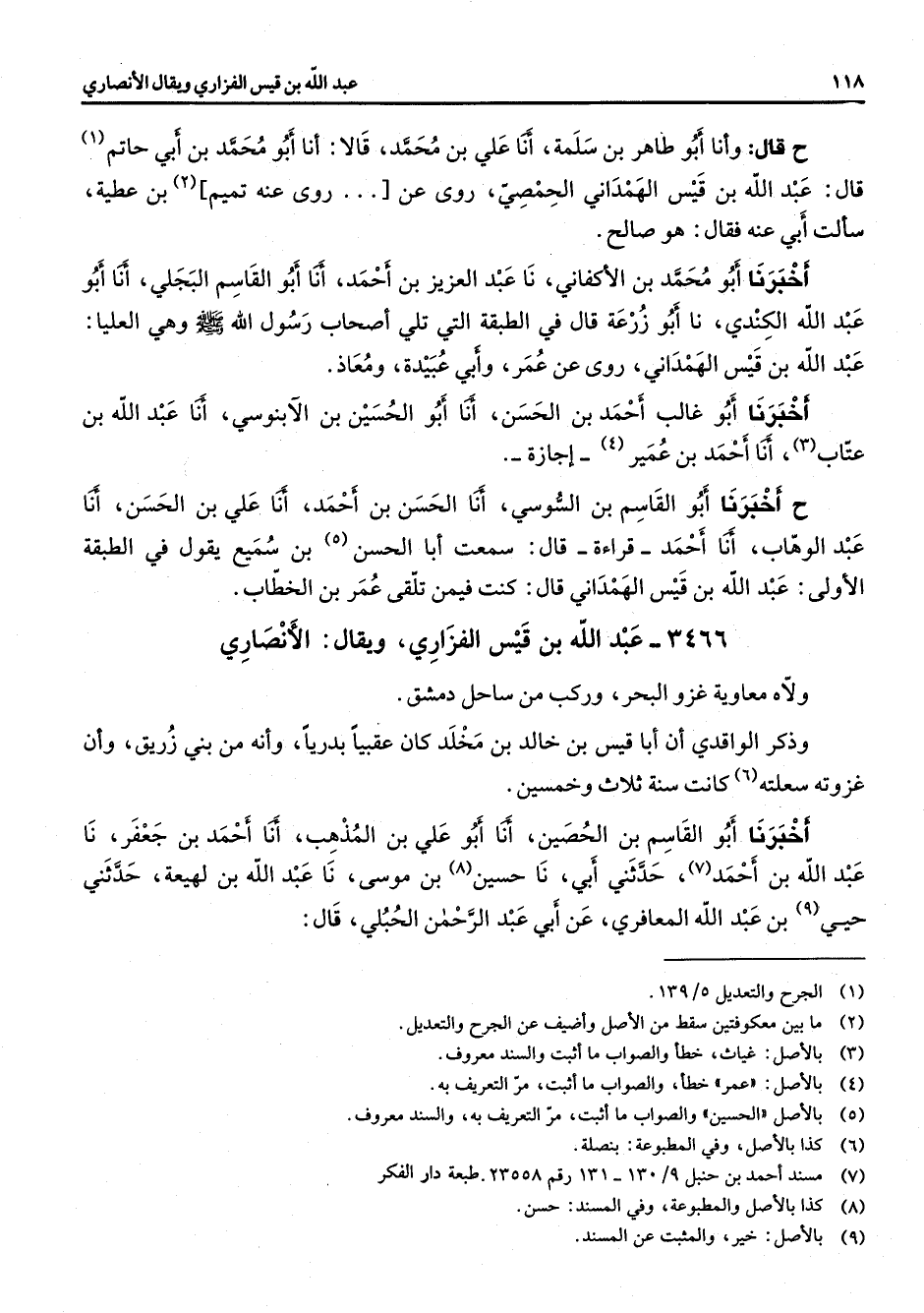 3466 - عبد الله بن قيس الفزاري ويقال الأنصاري ولاه معاوية غزو البحر وركب من ساحل دمشق وذكر الواقدي أن أبا قيس بن خالد بن مخلد كان عقبيا بدريا وانه من بني زريق وان غزوته سعلته (6) كانت سنة ثلاث وخمسين أخبرنا أبو القاسم بن الحصين أنا أبو علي بن المذهب أنا احمد بن جعفر نا عبد الله بن احمد (7) حدثني أبي نا حسين (8) بن موسى نا عبد الله بن لهيعة حدثني حيي (9) بن عبد الله المعافري عن أبي عبد الرحمن الحبلي قال