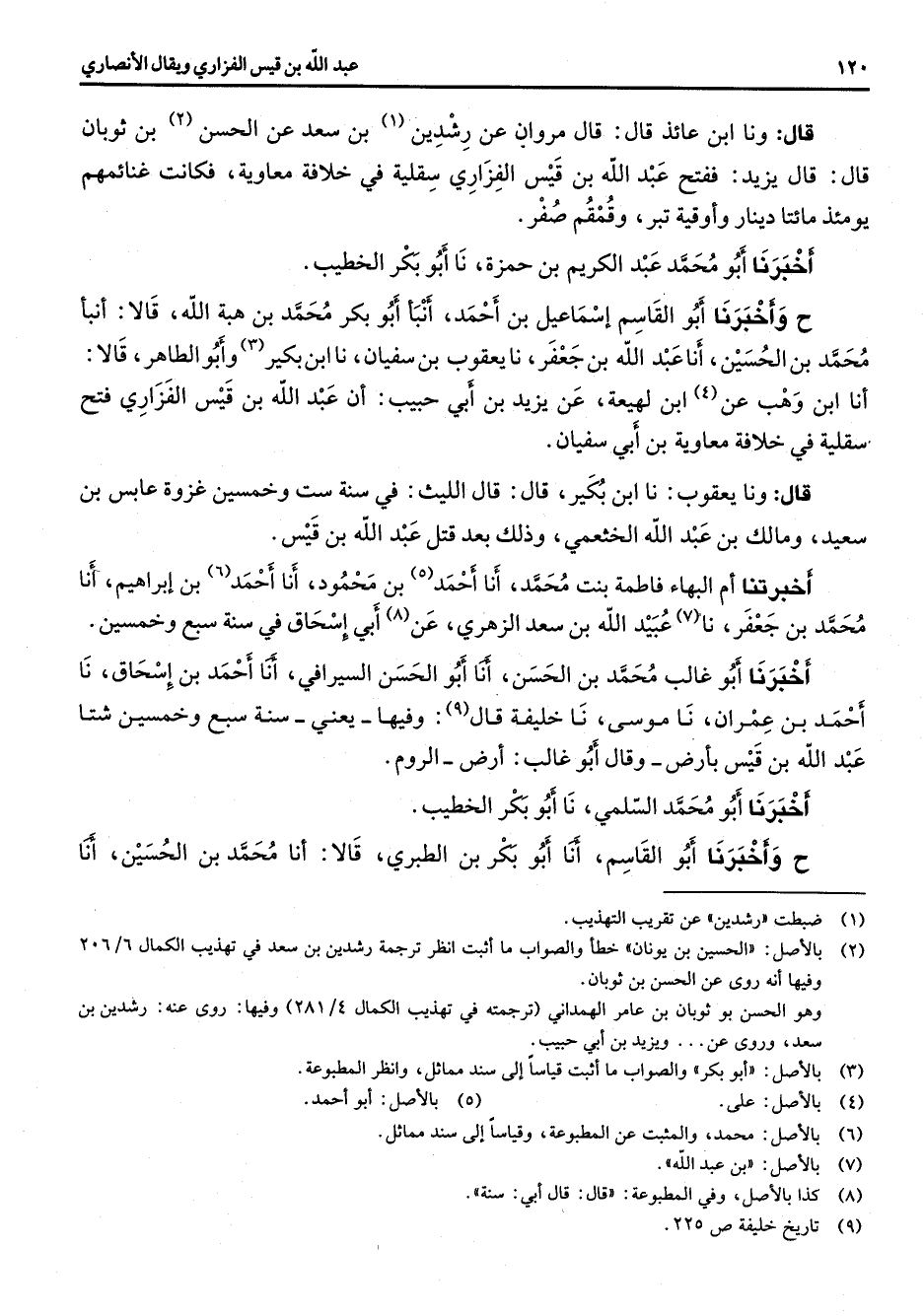 قال ونا ابن عائذ قال قال مروان عن رشدين (1) بن سعد عن الحسن (2) بن ثوبان قال قال يزيد ففتح عبد الله بن قيس الفزاري سقلية في خلافة معاوية فكانت عنائمهم يومئذ مائتا دينار واوقية تبر وقمقم صفر أخبرنا أبو محمد عبد الكريم بن حمزة نا أبو بكر الخطيب ح وأخبرنا أبو القاسم إسماعيل بن احمد أنبأ أبو بكر محمد بن هبة الله قالا أنبأ محمد بن الحسين أنا عبد الله بن جعفر نا يعقوب بن سفيان نا ابن بكير (3) وأبو الطاهر قالا أنا ابن وهب عن (4) ابن لهيعة عن يزيد بن أبي حبيب أن عبد الله بن قيس الفزاري فتح سقلية في خلافة معاوية بن أبي سفيان قال ونا يعقوب نا ابن بكير قال قال الليث في سنة ست وخمسين غزوة عابس بن سعيد ومالك بن عبد الله الخثعمي وذلك بعد قتل عبد الله بن قيس أخبرتنا أم البهاء فاطمة بنت محمد أنا احمد (5) بن محمود أنا احمد (6) بن إبراهيم أنا محمد بن جعفر نا (7) عبيد الله بن سعد الزهري عن (8) أبي إسحاق في سنة سبع وخمسين أخبرنا أبو غالب محمد بن الحسن أنا أبو الحسن السيرافي أنا احمد بن إسحاق نا احمد بن عمران نا موسى نا خليفة قال (9) وفيها يعني سنة سبع وخمسين شتا عبد الله بن قيس بأرض وقال أبو غالب ارض الروم أخبرنا أبو محمد السلمي نا أبو بكر الخطيب ح وأخبرنا أبو القاسم أنا أبو بكر بن الطبري قالا أنا محمد بن الحسين أنا