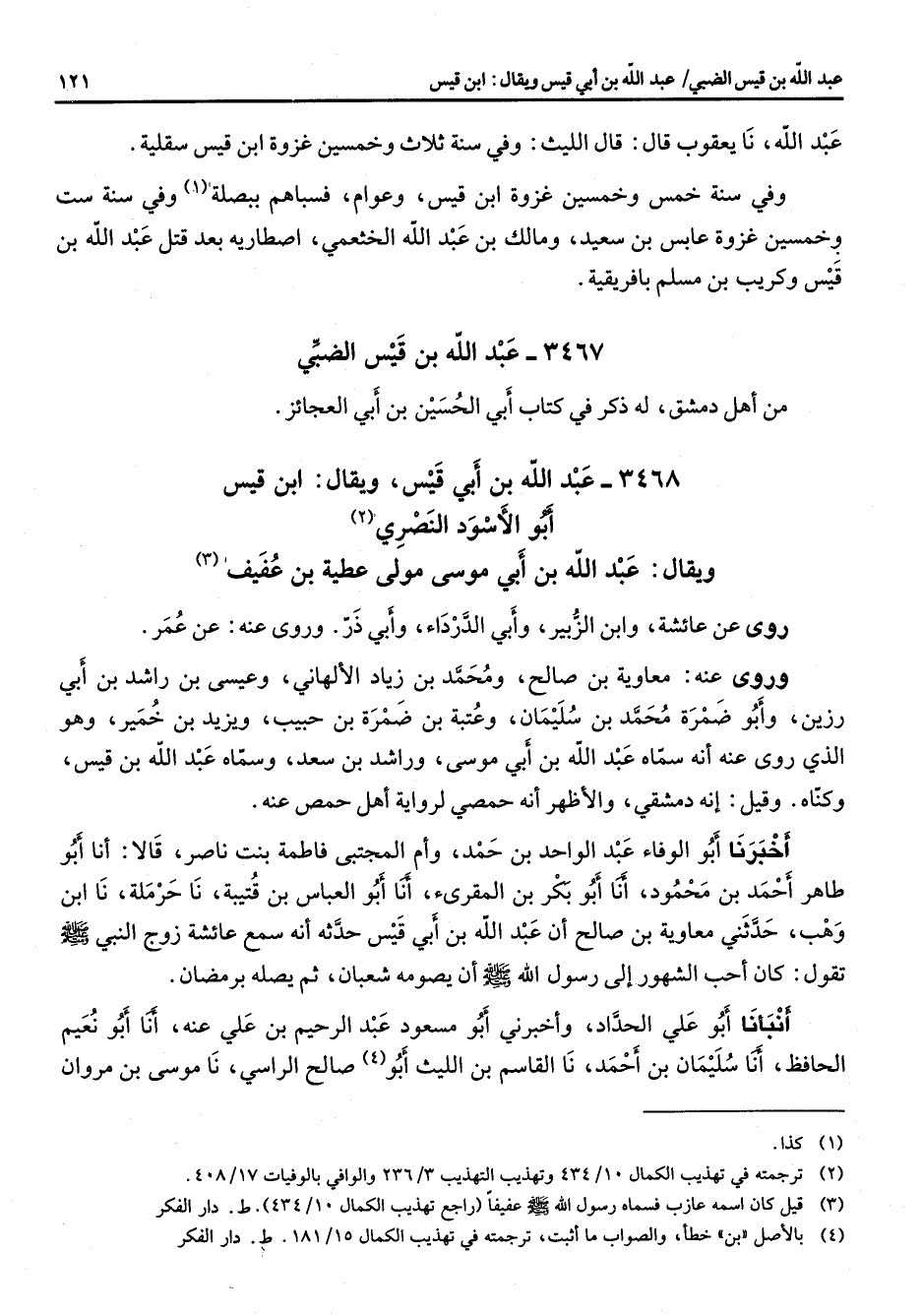 3468 - عبد الله بن أبي قيس ويقال ابن قيس أبو الأسود النصري (2) ويقال عبد الله بن أبي موسى مولى عطية بن عفيف (3) روى عن عائشة وابن الزبير وأبي الدرداء وأبي ذر وروى عنه عن عمر وروى عنه معاوية بن صالح ومحمد بن زياد الالهاني وعيسى بن راشد بن أبي رزين وأبو ضمرة محمد بن سليمان وعتبة بن ضمرة بن حبيب ويزيد بن خمير وهو الذي روى عنه انه سماه عبد الله بن أبي موسى وراشد بن سعد وسماه عبد الله بن قيس وكناه وقيل انه دمشقي والأظهر انه حمصي لرواية أهل حمص عنه أخبرنا أبو الوفاء عبد الواحد بن حمد وأم المجتبى فاطمة بنت ناصر قالا أنا أبو طاهر احمد بن محمود أنا أبو بكر بن المقرئ أنا أبو العباس بن قتيبة نا حرملة نا ابن وهب حدثني معاوية بن صالح أن عبد الله بن أبي قيس حدثه انه سمع عائشة زوج النبي (صلى الله عليه وسلم) تقول كان احب الشهور إلى رسول الله (صلى الله عليه وسلم) أن يصومه شعبان ثم يصله برمضان أنبأنا أبو علي الحداد واخبرني أبو مسعود عبد الرحيم بن علي عنه أنا أبو نعيم الحافظ أنا سليمان بن احمد نا القاسم بن الليث أبو (4) صالح الراسي نا موسى بن مروان