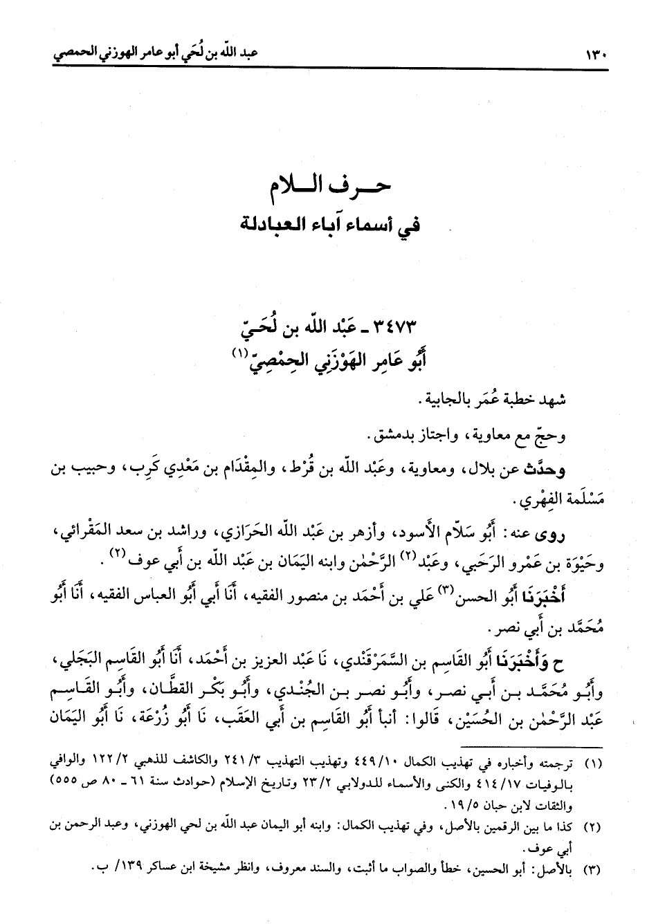 3473 - عبد الله بن لحي أبو عامر الهوزني الحمصي (1) شهد خطبة عمر بالجابية وحج مع معاوية واجتاز بدمشق وحدث عن بلال ومعاوية وعبد الله بن قرط والمقدام بن معدي كرب وحبيب بن مسلمة الفهري روى عنه أبو سلام الأسود وازهر بن عبد الله الحرازي وراشد بن سعد المقرائي وحيوة بن عمرو الرحبي وعبد (2) الرحمن وابنه اليمان بن عبد الله بن أبي عوف أخبرنا أبو الحسن (3) علي بن احمد بن منصور الفقيه أنا أبي أبو العباس الفقيه أنا أبو محمد بن أبي نصر ح وأخبرنا أبو القاسم بن السمرقندي نا عبد العزيز بن احمد أنا أبو القاسم البجلي وأبو محمد بن أبي نصر وأبو نصر بن الجندي وأبو بكر القطان وأبو القاسم عبد الرحمن بن الحسين قالوا أنبأ أبو القاسم بن أبي العقب نا أبو زرعة نا أبو اليمان