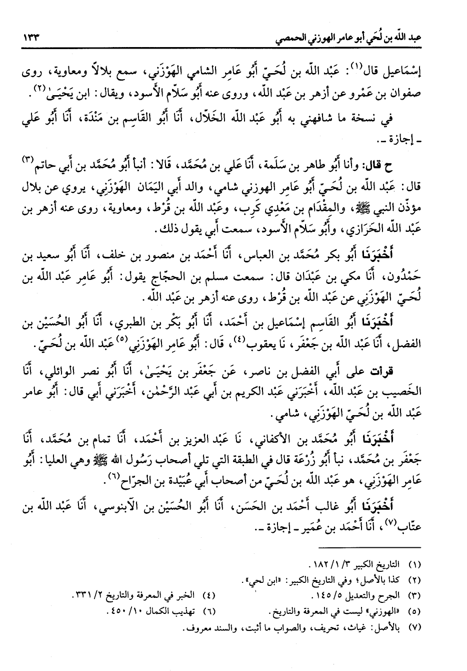إسماعيل قال (1) عبد الله بن لحي أبو عامر الشامي الهوزني سمع بلالا ومعاوية روى صفوان بن عمرو عن ازهر بن عبد الله وروى عنه أبو سلام الأسود ويقال ابن يحيى (2) في نسخة ما شافهني به أبو عبد الله الخلال أنا أبو القاسم بن مندة أنا أبو علي إجازة ح قال وأنا أبو طاهر بن سلمة أنا علي بن محمد قالا أنبأ أبو محمد بن أبي حاتم (3) قال عبد الله بن لحي أبو عامر الهوزني شامي والد أبي اليمان الهوزني يروي عن بلال مؤذن النبي (صلى الله عليه وسلم) والمقدام بن معدي كرب وعبد الله بن قرط ومعاوية روى عنه ازهر بن عبد الله الحرازي وأبو سلام الأسود سمعت أبي يقول ذلك أخبرنا أبو بكر محمد بن العباس أنا احمد بن منصور بن خلف أنا أبو سعيد بن حمدون أنا مكي بن عبدان قال سمعت مسلم بن الحجاج يقول أبو عامر عبد الله بن لحي الهوزني عن عبد الله بن قرط روى عنه ازهر بن عبد الله أخبرنا أبو القاسم إسماعيل بن احمد أنا أبو بكر بن الطبري انا أبو الحسين بن الفضل أنا عبد الله بن جعفر نا يعقوب (4) قال أبو عامر الهوزني (5) عبد الله بن لحي قرأت على أبي الفضل بن ناصر عن جعفر بن يحيى أنا أبو نصر الوائلي أنا الخصيب بن عبد الله أخبرني عبد الكريم بن أبي عبد الرحمن أخبرني أبي قال أبو عامر عبد الله بن لحي الهوزني شامي أخبرنا أبو محمد بن الأكفاني نا عبد العزيز بن احمد أنا تمام بن محمد أنا جعفر بن محمد نبأ أبو زرعة قال في الطبقة التي تلي أصحاب رسول الله (صلى الله عليه وسلم) وهي العليا أبو عامر الهوزني هو عبد الله بن لحي من أصحاب أبي عبيدة بن الجراح (6) أخبرنا أبو غالب احمد بن الحسن أنا أبو الحسين بن الآبنوسي أنا عبد الله بن عتاب (7) أنا احمد بن عمير إجازة
