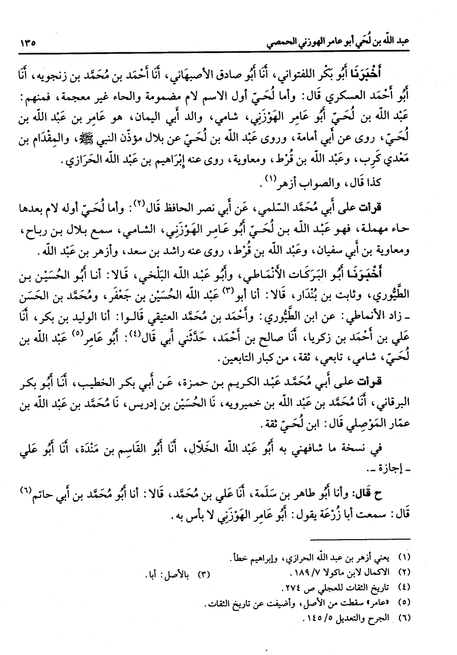 أخبرنا أبو بكر اللفتواني أنا أبو صادق الاصبهاني أنا احمد بن محمد بن زنجويه أنا أبو احمد العسكري قال وأما لحي أول الاسم لام مضمومة والحاء غير معجمة فمنهم عبد الله بن لحي أبو عامر الهوزني شامي والد أبي اليمان هو عامر بن عبد الله بن لحي روى عن أبي امامة وروى عبد الله بن لحي عن بلال مؤذن النبي (صلى الله عليه وسلم) والمقدام بن معدي كرب وعبد الله بن قرط ومعاوية روى عنه إبراهيم بن عبد الله الحرازي كذا قال والصواب ازهر (1) قرأت على أبي محمد السلمي عن أبي نصر الحافظ قال (2) واما لحي اوله لام بعدها حاء مهملة فهو عبد الله بن لحي أبو عامر الهوزني الشامي سمع بلال بن رباح ومعاوية بن أبي سفيان وعبد الله بن قرط روى عنه راشد بن سعد وازهر بن عبد الله أخبرنا أبو البركات الانماطي وأبو عبد الله البلخي قالا أنا أبو الحسين بن الطيوري وثابت بن بندار قالا أنا أبو (3) عبد الله الحسين بن جعفر ومحمد بن الحسن زاد الانماطي عن ابن الطيوري واحمد بن محمد العتيقي قالوا أنا الوليد بن بكر أنا علي بن احمد بن زكريا أنا صالح بن احمد حدثني أبي قال (4) أبو عامر (5) عبد الله بن لحي شامي تابعي ثقة من كبار التابعين قرأت على أبي محمد عبد الكريم بن حمزة عن أبي بكر الخطيب أنا أبو بكر البرقاني أنا محمد بن عبد الله بن خميرويه نا الحسين بن إدريس نا محمد بن عبد الله بن عمار الموصلي قال ابن لحي ثقة في نسخة ما شافهني به أبو عبد الله الخلال أنا أبو القاسم بن مندة أنا أبو علي إجازة ح قال وأنا أبو طاهر بن سلمة أنا علي بن محمد قالا أنا أبو محمد بن أبي حاتم (6) قال سمعت أبا زرعة يقول أبو عامر الهوزني لا بأس به