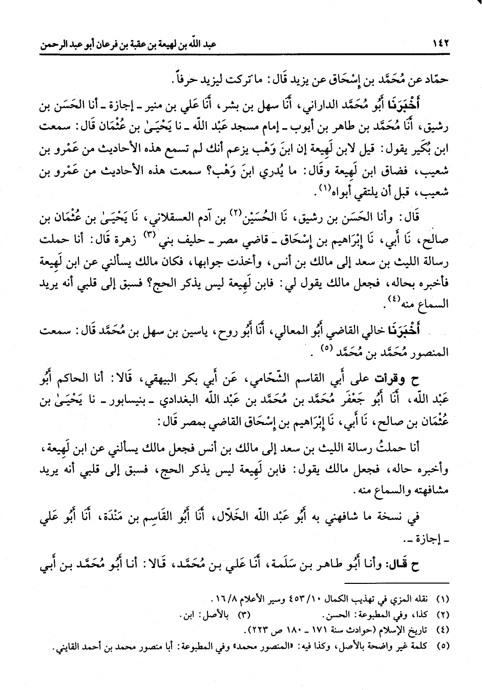 حماد عن محمد بن إسحاق عن يزيد قال ما تركت ليزيد حرفا أخبرنا أبو محمد الدارني أنا سهل بن بشر أنا علي بن منير إجازة أنا الحسن بن رشيق أنا محمد بن طاهر بن أيوب إمام مسجد عبد الله نا يحيى بن عثمان قال سمعت ابن بكير يقول قيل لابن لهيعة إن بن وهب يزعم أنك لم تسمع هذه الأحاديث من عمرو بن شعيب فضاق بن لهيعة وقال ما يدري ابن وهب يزعم انك لم سمعة هذه الأحاديث من عمرو بن شعيب قبل أن يلتقي ابواه (1) قال وأنا الحسن بن رشيق نا الحسين (2) بن آدم العسقلاني نا يحيى بن عثمان بن صالح نا أبي نا إبراهيم بن إسحاق قاضي مصر حليف بني (3) زهرة قال أنا حملت رسالة الليث بن سعد إلى مالك بن انس وأخذت جوابها فكان مالك يسألني عن ابن لهيعة فأخبره بحاله فجعل مالك يقول لي فابن لهيعة ليس يذكر الحج فسبق إلى قلبي انه يريد السماع منه (4) أخبرنا خالي القاضي أبو المعالي أنا أبو روح ياسين بن سهل بن محمد قال سمعت المنصور محمد بن محمد (5) ح وقرأت على أبي القاسم الشحامي عن أبي بكر البيهقي قالا أنا الحاكم أبو عبد الله أنا أبو جعفر محمد بن محمد بن عبد الله البغدادي بنيسابور نا يحيى بن عثمان بن صالح نا أبي نا إبراهيم بن إسحاق القاضي بمصر قال أنا حملت رسالة الليث بن سعد إلى مالك بن انس فجعل مالك يسألني عن ابن لهيعة واخبره حاله فجعل مالك يقول فابن لهيعة ليس يذكر الحج فسبق إلى قلبي انه يريد مشافهته والسماع منه في نسخة ما شافهني به أبو عبد الله الخلال أنا أبو القاسم بن مندة أنا أبو علي إجازة ح قال وأنا أبو طاهر بن سلمة أنا علي بن محمد قالا أنا أبو محمد بن أبي