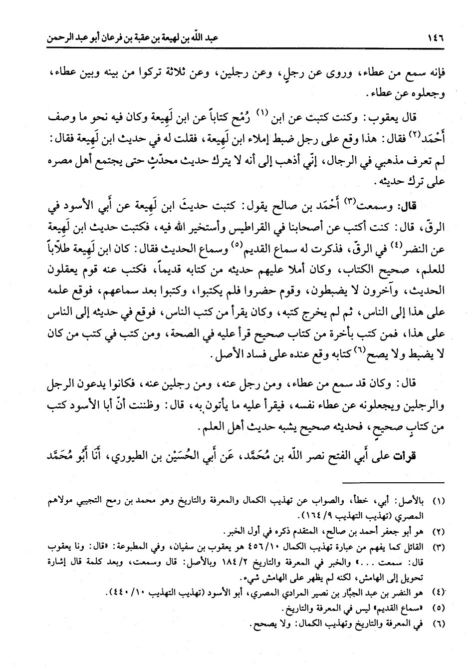 فإنه سمع من عطاء وروى عن رجل وعن رجلين وعن ثلاثة تركوا من بينه وبين عطاء وجعلوه عن عطاء قال يعقوب وكنت كتبت عن ابن (1) رمح كتابا عن ابن لهيعة وكان فيه نحو ما وصف احمد (2) فقال هذا وقع على رجل ضبط إملاء ابن لهيعة فقلت له في حديث ابن لهيعة فقال لم تعرف مذهب في الرجال إني اذهب إلى انه لا يترك حديث محدث حتى يجتمع أهل مصره على ترك حديثه قال وسمعت (3) احمد بن صالح يقول كتبت حديث ابن لهيعة عن أبي الأسود في الرق قال كنت اكتب عن اصحابنا في القراطيس واستخير الله فيه فكتبت حديث ابن لهيعة عن النضر (4) في الرق فذكرت له سماع القديم (5) وسماع الحديث فقال كان ابن لهيعة طلابا للعلم صحيح الكتاب وكان املا عليهم حديثه من كتابه قديما فكتب عنه قوم يعقلون الحديث وآخرون لا يضبطون وقوم حضروا فلم يكتبوا وكتبوا بعد سماعهم فوقع علمه على هذا إلى الناس ثم لم يخرج كتبه وكان يقرأ من كتب الناس فوقع في حديثه إلى الناس على هذا فمن كتب بأخره من كتاب صحيح قرا عليه في الصحة ومن كتب في كتب من كان لا يضبط ولا يصح (6) كتابه وقع عنده على فساد الأصل قال وكان قد سمع من عطاء ومن رجل عنه ومن رجلين عنه فكانوا يدعون الرجل والرجلين ويجعلونه عن عطاء نفسه فيقرأ عليه ما يأتون به قال وظننت أن أبا الأسود كتب من كتاب صحيح فحديثه صحيح يشبه حديث أهل العلم قرأت على أبي الفتح نصر الله بن محمد عن أبي الحسين بن الطيوري أنا أبو محمد