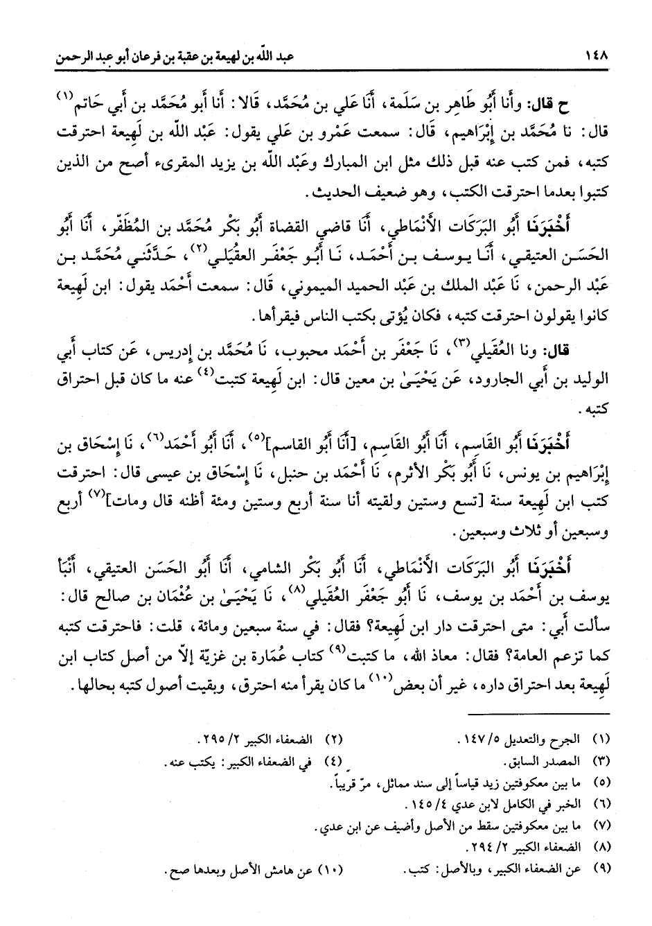 ح قال وأنا أبو طاهر بن سلمة أنا علي بن محمد قالا أنا أبو محمد بن أبي حاتم (1) قال نا محمد بن إبراهيم قال سمعت عمرو بن علي يقول عبد الله بن لهيعة احترقت كتبه فمن كتب عنه قبل ذلك مثل ابن المبارك وعبد الله بن يزيد المقرئ اصح من الذين كتبوا بعدما احترقت الكتب وهو ضعيف الحديث أخبرنا أبو البركات الأنماطي أنا قاضي القضاة أبو بكر محمد بن المظفر أنا أبو الحسن العتيقي أنا يوسف بن احمد نا أبو جعفر العقيلي (2) حدثني محمد بن عبد الرحمن نا عبد الملك بن عبد الحميد الميموني قال سمعت احمد يقول ابن لهيعة كانوا يقولون احترقت كتبه فكان يؤتى بكتب الناس فيقرأها قال ونا العقيلي (3) نا جعفر بن احمد محبوب نا محمد بن إدريس عن كتاب أبي الوليد بن أبي الجارود عن يحيى بن معين قال ابن لهيعة كتبت (4) عنه ما كان قبل احتراق كتبه أخبرنا أبو القاسم أنا أبو القاسم أنا أبو القاسم (5) أنا أبو احمد (6) نا إسحاق بن إبراهيم بن يونس نا أبو بكر الاثرم نا احمد بن حنبل ح نا إسحاق بن عيسى قال احترقت كتب ابن لهيعة سنة تسع وستين ولقيته أنا سنة أربع وستين ومئة أظنه قال ومات (7) أربع وسبعين أو ثلاث وسبعين أخبرنا أبو البركات الانماطي أنا أبو بكر الشامي أنا أبو الحسن العتيقي أنبأ يوسف بن احمد بن يوسف نا أبو جعفر العقيلي (8) نا يحيى بن عثمان بن صالح قال سألت أبي متى احترقت دار ابن لهيعة فقال في سنة سبعين ومائة قلت فاحترقت كتبه كما تزعم العامة فقال معاذ الله ما كتبت (9) كتاب عمارة بن غزية إلا من اصل كتاب ابن لهيعة بعد احتراق داره غير أن بعض (10) ما كان يقرأ منه احترق وبقيت اصول كتبه بحالها
