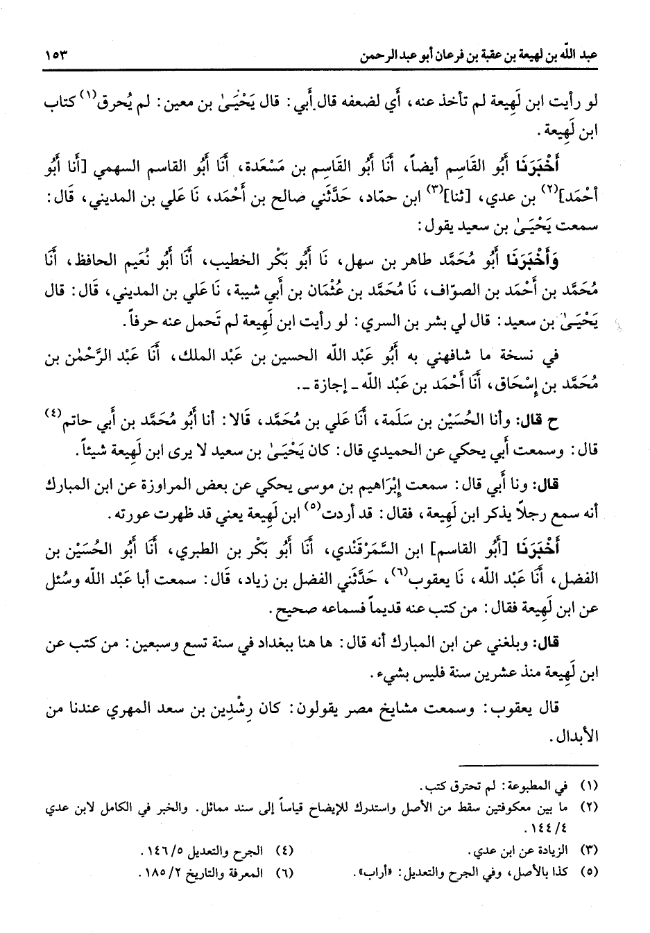 لو رأيت ابن لهيعة لم تأخذ عنه أي لضعفه قال أبي قال يحيى بن معين لم يحرق (1) كتاب ابن لهيعة أخبرنا أبو القاسم أيضا أنا أبو القاسم بن مسعدة أنا أبو القاسم السهمي أنا أبو احمد (2) بن عدي ثنا (3) ابن حماد حدثني صالح بن احمد نا علي بن المديني قال سمعت يحيى بن سعيد يقول وأخبرنا أبو محمد طاهر بن سهل نا أبو بكر الخطيب أنا أبو نعيم الحافظ أنا محمد بن احمد بن الصواف نا محمد بن عثمان بن أبي شيبة نا علي بن المديني قال قال يحيى بن سعيد قال لي بشر بن السري لو رأيت ابن لهيعة لم تحمل عنه حرفا في نسخة ما شافهني به أبو عبد الله الحسين بن عبد الملك أنا عبد الرحمن بن محمد بن إسحاق أنا احمد بن عبد الله إجازة ح قال وأنا الحسين بن سلمة انا علي بن محمد قالا أنا بو محمد بن أبي حاتم (4) قال وسمعت أبي يحكي عن الحميدي قال كان يحيى بن سعيد لا يرى ابن لهيعة شيئا قال ونا أبي قال سمعت إبراهيم بن موسى يحكي عن بعض المراوزة عن ابن المبارك انه سمع رجلا يذكر ابن لهيعة فقال قد اردت (5) ابن لهيعة يعني قد ظهرت عورته أخبرنا أبو القاسم بن السمرقندي أنا أبو بكر بن الطبري أنا أبو الحسين بن الفضل أنا عبد الله نا يعقوب (6) حدثني الفضل بن زياد قال سمعت أبا عبد الله وسئل عن ابن لهيعة فقال من كتب عنه قديما فسماعه صحيح قال وبلغني عن ابن المبارك انه قال ها هنا ببغداد في سنة تسع وسبعين من كتب عن ابن لهيعة منذ عشرين سنة فليس بشئ قال يعقوب وسمعت مشايخ مصر يقولون كان رشدين بن سعد المهري عندنا من الابدال