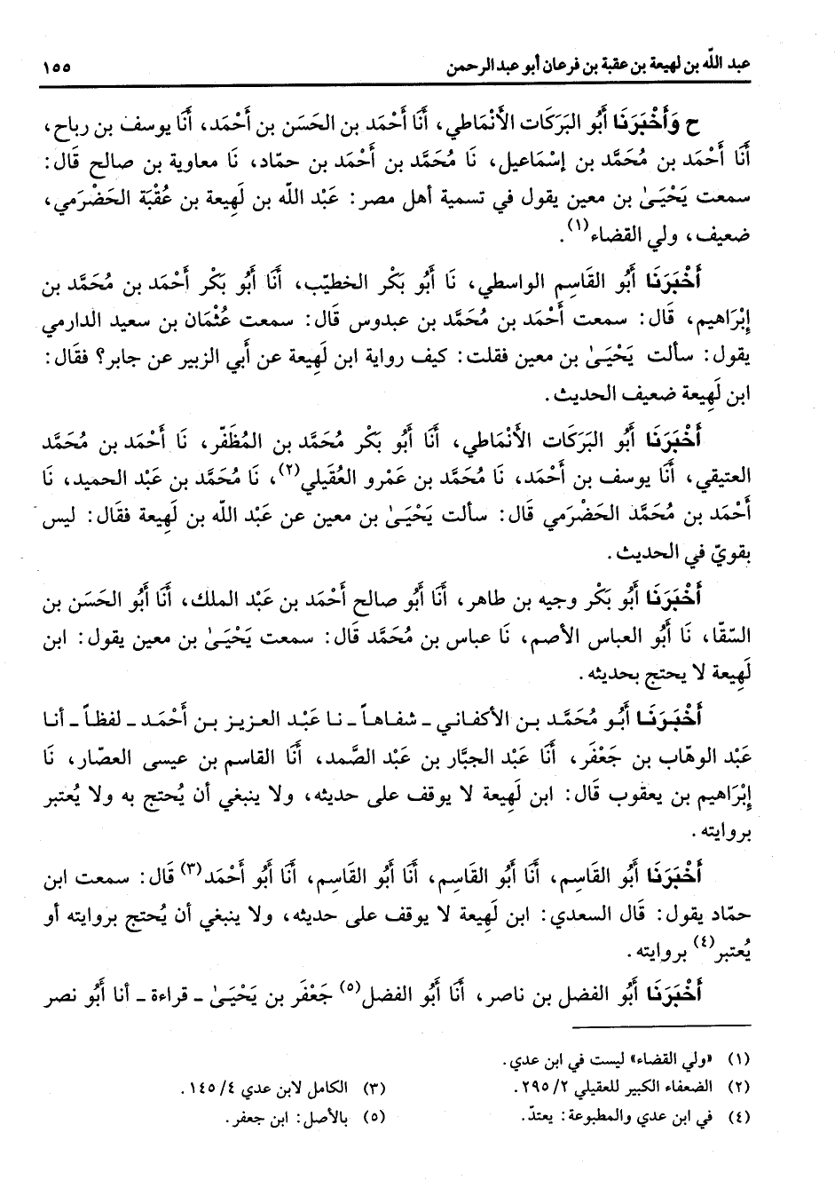ح وأخبرنا أبو البركات الانماطي أنا احمد بن الحسن بن احمد أنا يوسف بن رباح انا احمد بن محمد بن إسماعيل نا محمد بن احمد بن حماد نا معاوية بن صالح قال سمعت يحيى بن معين يقول في تسمية أهل مصر عبد الله بن لهيعة بن عقبة الحضرمي ضعيف ولي القضاء (1) أخبرنا أبو القاسم الواسطي نا أبو بكر الخطيب أنا أبو بكر احمد بن محمد بن إبراهيم قال سمعت احمد بن محمد بن عبدوس قال سمعت عثمان بن سعيد الدارمي يقول سألت يحيى بن معين فقلت كيف رواية ابن لهيعة عن أبي الزبير عن جابر فقال ابن لهيعة ضعيف الحديث أخبرنا أبو البركات الانماطي أنا أبو بكر محمد بن المظفر نا أحمد بن محمد العتيقي أنا يوسف بن احمد نا محمد بن عمرو العقيلي (2) نا محمد بن عبد الحميد نا احمد بن محمد الحضرمي قال سألت يحيى بن معين عن عبد الله بن لهيعة فقال ليس بقوي في الحديث أخبرنا أبو بكر وجيه بن طاهر أنا أبو صالح احمد بن عبد الملك أنا أبو الحسن بن السقا نا أبو العباس الاصم نا عباس بن محمد قال سمعت يحيى بن معين يقول ابن لهيعة لا يحتج بحديثه أخبرنا أبو محمد بن الاكفاني شفاها نا عبد العزيز بن احمد لفظا أنا عبد الوهاب بن جعفر أنا عبد الجبار بن عبد الصمد أنا القاسم بن عيسى العصار نا إبراهيم بن يعقوب قال ابن لهيعة لا يوقف على حديثه ولا ينبغي أن يحتج به ولا يعتبر بروايته أخبرنا أبو القاسم أنا أبو القاسم أنا القاسم انا أبو أحمد (3) قال سمعت بن حماد يقول قال السعدي بن لهيعة لا يوقف على حديثه ولا ينبغي أن يحتج بروايته أو يعتبر (4) بروايته أخبرنا أبو الفضل (5) بن ناصر جعفر بن يحيى قراءة أنا أبو نصر