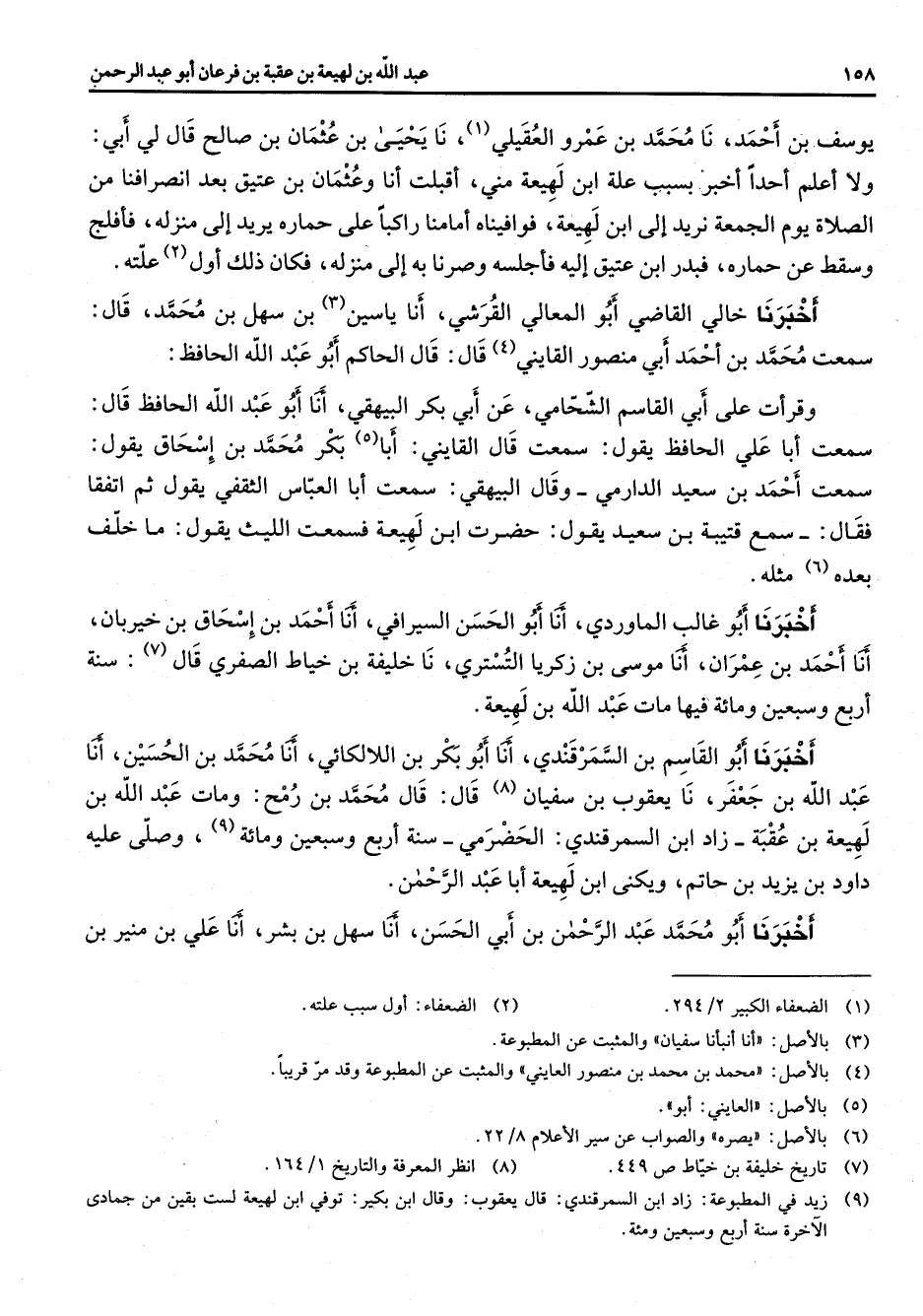 يوسف بن احمد نا محمد بن عمرو العقيلي (1) نا يحيى بن عثمان بن صالح قال لي أبي ولا اعلم أحدا أخبر بسبب علة ابن لهيعة مني أقبلت أنا وعثمان بن عتيق بعد انصرافنا من الصلاة يوم الجمعة نريد إلى ابن لهيعة فوافيناه امامنا راكبا على حماره يريد إلى منزره فأفلج وسقط عن حماره فبدر ابن عتيق إليه فأجلسه وصرنا به إلى منزله فكان ذلك أول (2) علته اخبرنا خالي القاضي أبو المعالي القرشي أنا ياسين (3) بن سهل بن محمد قال سمعت محمد بن احمد أبي منصور القايني (4) قال قال الحاكم أبو عبد الله الحافظ وقرأت على أبي القاسم الشحامي عن أبي بكر البيهقي أنا أبو عبد الله الحافظ قال سمعت أبا علي الحافظ يقول سمعت قال القايني أبا (5) بكر محمد بن إسحاق يقول سمعت احمد بن سعيد الدارمي وقال البيهقي سمعت أبا العباس الثقفي يقول ثم اتفقا فقال سمع قتيبة بن سعيد يقول حضرت ابن لهيعة فسمعت الليث يقول ما خلف بعده (6) مثله أخبرنا أبو غالب الماوردي أنا أبو الحسن السيرافي أنا احمد بن إسحاق بن خيربان أنا أحمد بن عمران أنا موسى بن زكريا التستري نا خليفة بن خياط الصفري (7) قال سنة أربع وسبعين ومائة فيها مات عبد الله بن لهيعة أخبرنا أبو القاسم بن السمرقندي أنا أبو بكر بن اللالكائي أنا محمد بن الحسين أنا عبد الله بن جعفر نا يعقوب بن سفيان (8) قال قال محمد بن رمح ومات عبد الله بن لهيعة بن عقبة زاد ابن السمرقندي الحضرمي سنة أربع وسبعين ومائة (9) وصلى عليه داود بن يزيد بن حاتم ويكنى ابن لهيعة أبا عبد الرحمن أخبرنا أبو محمد عبد الرحمن بن أبي الحسن أنا سهل بن بشر أنا علي بن منير بن