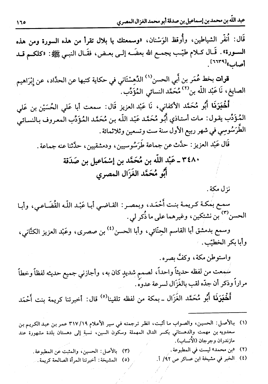 [6639] قرأت بخط عمر بن أبي الحسن (1) الدهستاني في حكاية كتبها عن الحداد عن إبراهيم الصايغ نا عبد الله بن (2) محمد النسائي المؤدب أخبرنا أبو محمد الأكفاني نا عبد العزيز قال سمعت أبا علي الحسين بن علي المؤدب يقول مات استاذي أبو محمد عبد الله بن محمد المؤدب المعروف بالنسائي الطرسوسي في شهر ربيع الأول سنة ست وتسعين وثلاثمائة قال عبد العزيز حدث عن جماعة طرسوسيين ودمشقيين حدثنا عنه جماعة 348 (عبد الله بن محمد بن إسماعيل بن صدقة أبو محمد الغزال المصري نزل مكة سمع بمكة كريمة بنت احمد وبمصر القاضي أبا عبد الله القضاعي وأبا الحسن (3) بن نشتكين وغيرهما على ما ذكر لي وسمع بدمشق أبا القاسم الحنائي وأبا الحسن (4) بن صصرى وعبد العزيز الكتاني وأبا بكر الخطيب واستوطن مكة وكف بصره سمعت من لفظه حديثا واحدا لصم شديد كان به واجازني جميع حديثه لفظا وخطا مرارا وذكر أن جده لقب بالغزال لسرعة عدوه أخبرنا أبو محمد الغزال بمكة من لفظه تلقينا (5) قال أخبرتنا كريمة بنت احمد