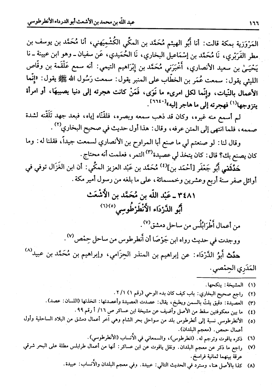 3481 - عبد الله بن محمد بن الاشعث أبو الدرداء الانطرطوسي (5) (6) من أعمال اطرابلس من ساحل دمشق ووجدت في حديث رواه بن جوصا أن انطرطوس من ساحل حمص (7) حدث أبو الدرداء عن إبراهيم بن المنذر الحزامي وابراهيم بن محمد بن عبيد 8 المدري الحمصي