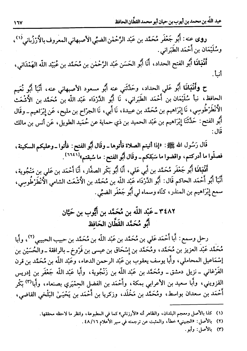 3482 - عبد الله بن محمد بن أيوب بن حيان أبو محمد القطان الحافظ رحل وسمع أبا احمد علي بن محمد بن عبد الله بن محمد بن حبيب الحبيبي (2) وأبا محمد عبد العزيز بن محمد ومحمد بن إسحاق بن عيسى بن فروخ بالرافقة والحسين بن إسماعيل المحاملي وأبا يوسف يعقوب بن عبد الرحمن الدعاء وعبد الله بن محمد بن قرن الفرغاني نزيل دمشق ومحمد بن عبد الله بن زنجوية وأبا عبد الله جعفر بن إدريس القزويني وأبا سعيد بن الأعرابي بمكة واحمد بن الفضل الحميري بصنعاء وأبا (3) بكر احمد بن سعدان بواسط ومحمد بن مخلد وزكريا بن احمد بن يحيى البلخي القاضي