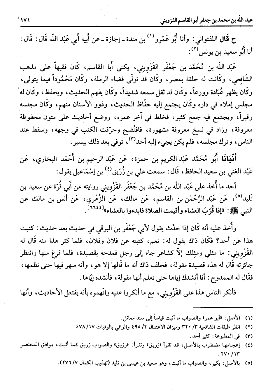 ح قال اللفتواني وأنا أبو عمرو (1) بن مندة اجازة عن أبيه أبي عبد الله قال قال أنا أبو سعيد بن يونس (2) عبد الله بن محمد بن جعفر القزويني يكنى أبا القاسم كان فقيها على مذهب الشافعي وكانت له حلقة بمصر وكان قد تولى قضاء الرملة وكان محمودا فيما يتولى وكان يظهر عبادة وورعا وكان قد ثقل سمعه شديدا وكان يفهم الحديث ويحفظ وكان له مجلس إملاء في داره وكان يجتمع إليه حفاظ الحديث وذوو الأسنان منهم وكان مجلسه وقيرا ويجتمع فيه جمع كثير فخلط في آخر عمره ووضع أحاديث على متون محفوظة معروفة وزاد في نسخ معروفة مشهورة فافتضح وحرقت الكتب في وجهه وسقط عند الناس وترك مجلسه فلم يكن يجئ إليه أحد (3) توفي بعد ذلك بيسير أنبأنا أبو محمد عبد الكريم بن حمزة عن عبد الرحيم بن احمد البخاري عن عبد الغني بن سعيدد الحافظ قال سمعت علي بن زريق (4) بن إسماعيل يقول احد ما اخذ على عبد الله بن محمد بن جعفر القزويني روايته عن أبي قرة عن سعيد بن تليد (5) عن عبد الرحمن بن القاسم عن مالك عن الزهري عن انس بن مالك عن النبي (صلى الله عليه وسلم) إذا قرب العشاء واقيمت الصلاة فابدءوا بالعشاء