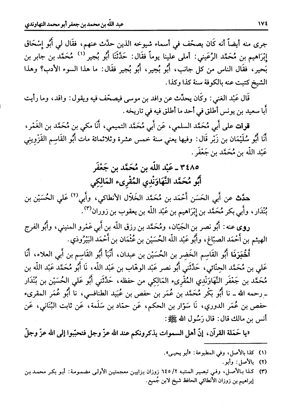 3485 - عبد الله بن محمد بن جعفر أبو محمد النهاوندي المقرئ المالكي حدث عن أبي الحسن احمد بن محمد الخلال الانطاكي وأبي (2) علي الحسين بن بندار وأبي بكر محمد بن إبراهيم بن عبد الله بن يعقوب بن زوران (3) روى عنه أبو نصر بن الحبان ومحمد بن رزق الله بن أبي عمرو المنيني وأبو الفرج الهيثم بن احمد الصباغ وأبو عبد الله الحسين بن عثمان بن احمد البيروذي أخبرنا أبو القاسم الخضر بن الحسين بن عبدان أنبأ أبو القاسم بن أبي العلاء أنا علي بن محمد الحنائي حدثني أبو نصر عبد الوهاب بن عبد الله نا أبو محمد عبد الله بن محمد بن جعفر النهاوندي المقرئ المالكي من حفظه حدثني أبو علي الحسين بن بندار رحمه الله نا أبو بكر محمد بن عمر بن حفص بن عبيد الطنافسي نا أبو عمر المقرئ حفص بن عمر الدوري نا سوار بن الحكم عن حماد بن سلمة عن ثابت البناني عن انس بن مالك قال قال رسول الله (صلى الله عليه وسلم) يا حملة القران إن أهل السموات يذكرونكم عند الله عز وجل فتحببوا إلى الله عز وجل