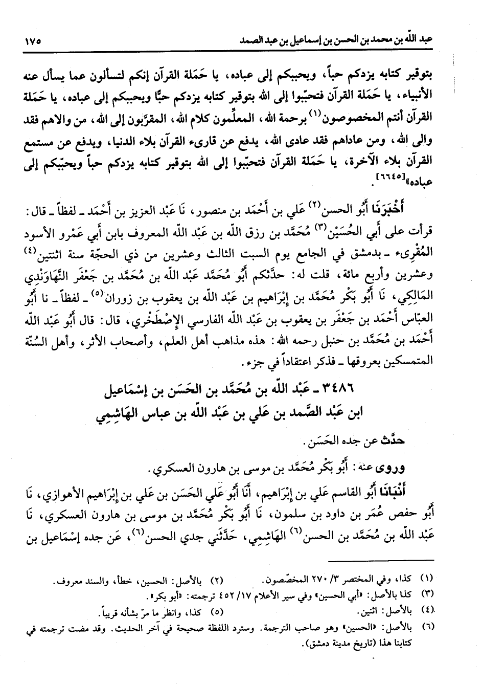 3486 - عبد الله بن محمد بن الحسن بن إسماعيل ابن عبد الصمد بن علي بن عبد الله بن عباس الهاشمي حدث عن جده الحسن وروى عنه أبو بكر محمد بن موسى بن هارون العسكري أنبأنا أبو القاسم علي بن إبراهيم أنا أبو علي الحسن بن علي بن إبراهيم الاهوازي نا أبو حفص عمر بن داود بن سلمون نا أبو بكر محمد بن موسى بن هارون العسكري نا عبد الله بن محمد بن الحسن (6) الهاشمي حدثني جدي الحسن (6) عن جده إسماعيل بن