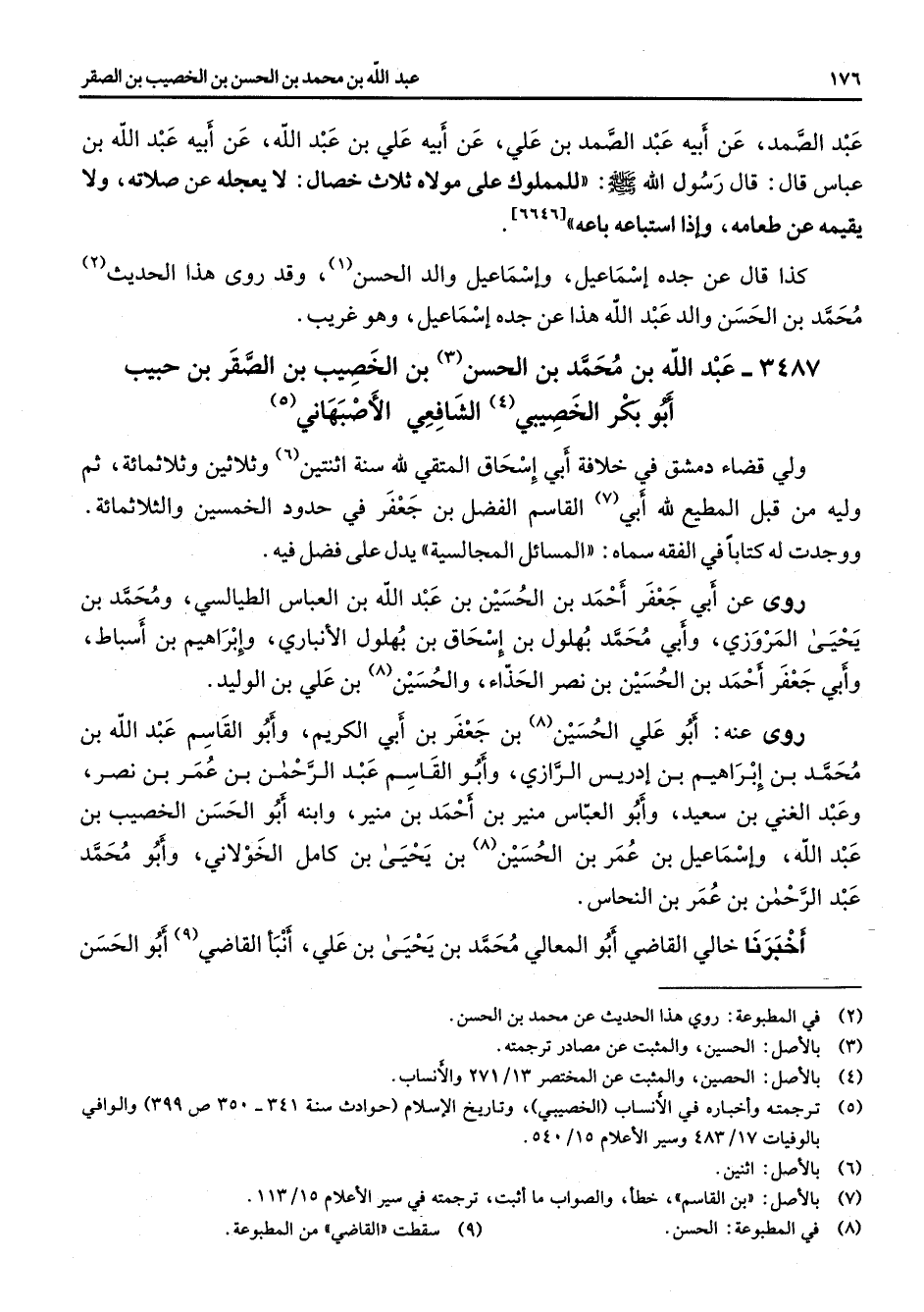 3487 - عبد الله بن محمد بن الحسن (3) بن الخصيب بن الصقر بن حبيب أبو بكر الخصيبي (4) الشافعي الاصبهاني (5) ولي قضاء دمشق في خلافة أبي إسحاق المتقي لله سنة اثنتين (6) وثلاثين وثلاثمائة ثم وليه من قبل المطيع لله أبي (7) القاسم الفضل بن جعفر في حدود الخمسين والثلاثمائة ووجدت له كتابا في الفقه سماه المسائل المجالسية يدل على فضل فيه روى عن أبي جعفر احمد بن الحسين جبن عبد الله بن العباس الطيالسي ومحمد بن يحيى المروزي وأبي محمد بهلول بن إسحاق بن بهلول الانباري وإبراهيم بن اسباط وأبي جعفر احمد بن الحسين (8) بن نصر الحذاء والحسين (8) بن علي بن الوليد روى عنه أبو علي الحسين بن جعفر بن أبي الكريم وأبو القاسم عبد الله بن محمد بن إبراهيم بن إدريس الرازي وأبو القاسم عبد الرحمن بن عمر بن نصر وعبد الغني بن سعيد وأبو العباس منير بن احمد بن منير وابنه أبو الحسن الخصيب بن عبد الله وإسماعيل بن عمر بن الحسين (8) بن يحيى بن كامل الخولاني وأبو محمد عبد الرحمن بن عمر بن النحاس أخبرنا خالي القاضي أبو المعالي محمد بن يحيى بن علي أنبأ القاضي (9) أبو الحسن