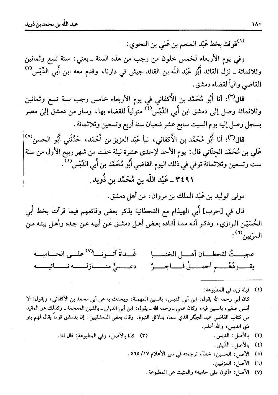 3491 - عبد الله بن محمد بن ذويد مولى الوليد بن عبد الملك بن مروان من أهل دمشق قال في حرب أبي الهيذام مع القحطانية يذكر بعض وقائعهم فيما قرأت بخط أبي الحسين الرازي وذكر انه مما افاده بعض أهل دمشق عن أبيه عن جده وأهل بيته من المريين (6) عجبت لقحطان أهل الخنسا * غداة اتونا (7) على الحاميه يقودهم احمق فاجر * دعي منازله نائيه