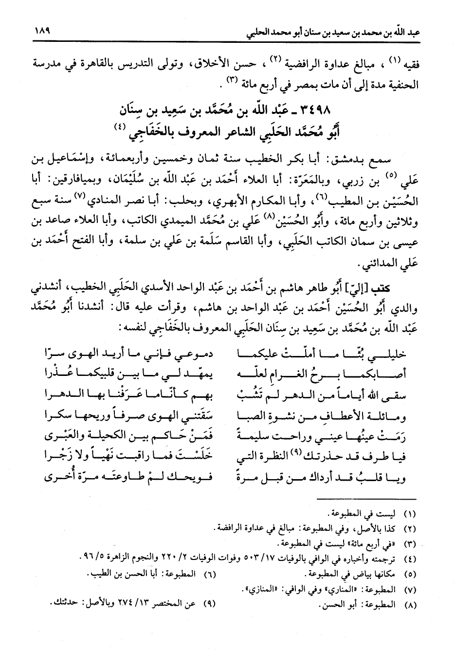 3498 - عبد الله بن محمد بن سعيد بن سنان أبو محمد الحلبي الشاعر المعروف بالخفاجي (4) سمع بدمشق أبا بكر الخطيب سنة ثمان وخمسين وأربعمائة وإسماعيل بن علي (5) بن زربي وبالمعرة أبا العلاء احمد بن عبد الله بن سليمان وبميافارقين أبا الحسين بن المطيب (6) وأبا المكارم الابهري وبحلب أبا نصر المنادي (7) سنة سبع وثلاثين واربع مائة وأبو الحسين (8) علي بن محمد الميمدي الكاتب وأبا العلاء صاعد بن عيسى بن سمان الكاتب الحلبي وأبا القاسم سلمة بن علي بن سلمة وأبا الفتح احمد بن علي المدائني كتب الي أبو طاهر هاشم بن احمد بن عبد الواحد الاسدي الحلبي الخطيب انشدني والذي أبو الحسين احمد بن عبد الواحد بن هاشم وقرأت عليه قال انشدنا أبو محمد عبد الله بن محمد بن سعيد بن سنان الحلبي المعروف بالخفاجي لنفسه خليلي بثا ما املت عليكما * دموعي فأني ما أريد الهوى سرا أصابكما برح الغرام لعله * يمهد لي ما بين قلبيكما عذرا سقى الله أياما من الدهر لم تشب * بهم كأناما عرفنا بها الدهرا ومائلة الأعطاف من نشوة الصبا * سقتني الهوى صرفا وريحها سكرا رمت عينها عيني وراحت سليمة * فمن حاكم بين الكحيلة والعبرى فيا طرف قد حذرتك النظرة التي * خلست فما راقبت نهيا ولا زجرا ويا قلب قد أرداك من قبل مرة * فويحك لم طاوعته مرة أخرى *