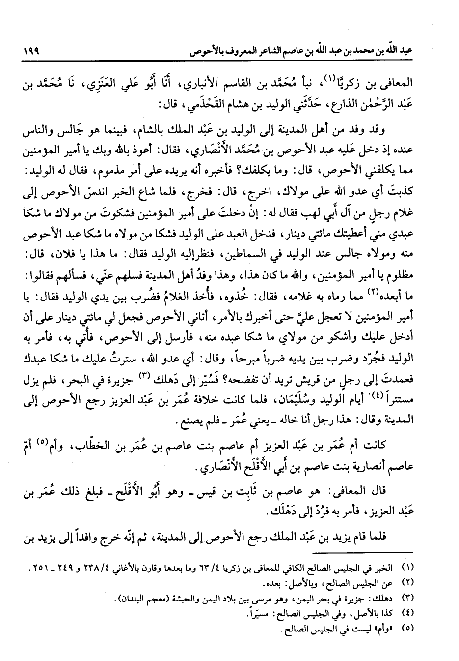المعافى بن زكريا (1) نبأ محمد بن القاسم الانباري أنا أبو علي العنزي نا محمد بن عبد الرحمن الذارع حدثني الوليد بن هشام القحذمي قال وقد وفد من أهل المدينة إلى الوليد بن عبد الملك بالشام فبينما هو جالس والناس عنده إذ دخل عليه عبد الأحوص بن محمد الأنصاري فقال أعوذ بالله وبك يا أمير المؤمنين مما يكلفني الأحوص قال وما يكلفك فأخبره انه يريده على أمر مذموم فقال له الوليد كذبت أي عدو الله على مولاك اخرج قال فخرج فلما شاع الخبر أندس الاحوص إلى غلام رجل من آل أبي لهب فقال له إن دخلت على أمير المؤمنين فشكوت من مولاك ما شكا عبدي مني اعطيتك مائتي دينار فدخل العبد على الوليد فشكا من مولاه ما شكا عبد الاحوص منه ومولاه جالس عند الوليد في السماطين فنظر إليه الوليد فقال ما هذا يا فلان قال مظلوم يا أمير المؤمنين والله ما كان هذا وهذا وفد أهل المدينة فسلهم عني فسألهم فقالوا ما أبعده (2) مما رماه به غلامه فقال خذوه فأخذ الغلام فضرب بين يدي الوليد فقال يا أمير المؤمنين لا تعجل علي حتى أخبرك بالأمر أتاني الاحوص فجعل لي مائتي دينار على أن ادخل عليك واشكو من مولاي ما شكا عبده منه فأرسل إلى الاحوص فأتي به فأمر به الوليد فجرد وضرب بين يديه ضربا مبرحا وقال أي عدو الله سترت عليك ما شكا عبدك فعمدت إلى رجل من قريش تريد أن تفصحه فسير إلى دهلك (3) جزيرة في البحر فلم يزل مستترا (4) أيام الوليد وسليمان فلما كانت خلافة عمر بن عبد العزيز رجع الاحوص إلى المدينة وقال هذا رجل أنا خاله يعني عمر فلم يصنع كانت أم عمر بن عبد العزيز أم عاصم بنت عاصم بن عمر بن الخطاب وأم (5) أم عاصم أنصارية بنت عاصم بن أبي الاقلح الأنصاري قال المعافي هو عاصم بن ثابت بن قيس وهو أبو الاقلح فبلغ ذلك عمر بن عبد العزيز فأمر به فرد إلى دهلك فلما قام يزيد بن عبد الملك رجع الاحوص إلى المدينة ثم انه خرج وافدا إلى يزيد بن