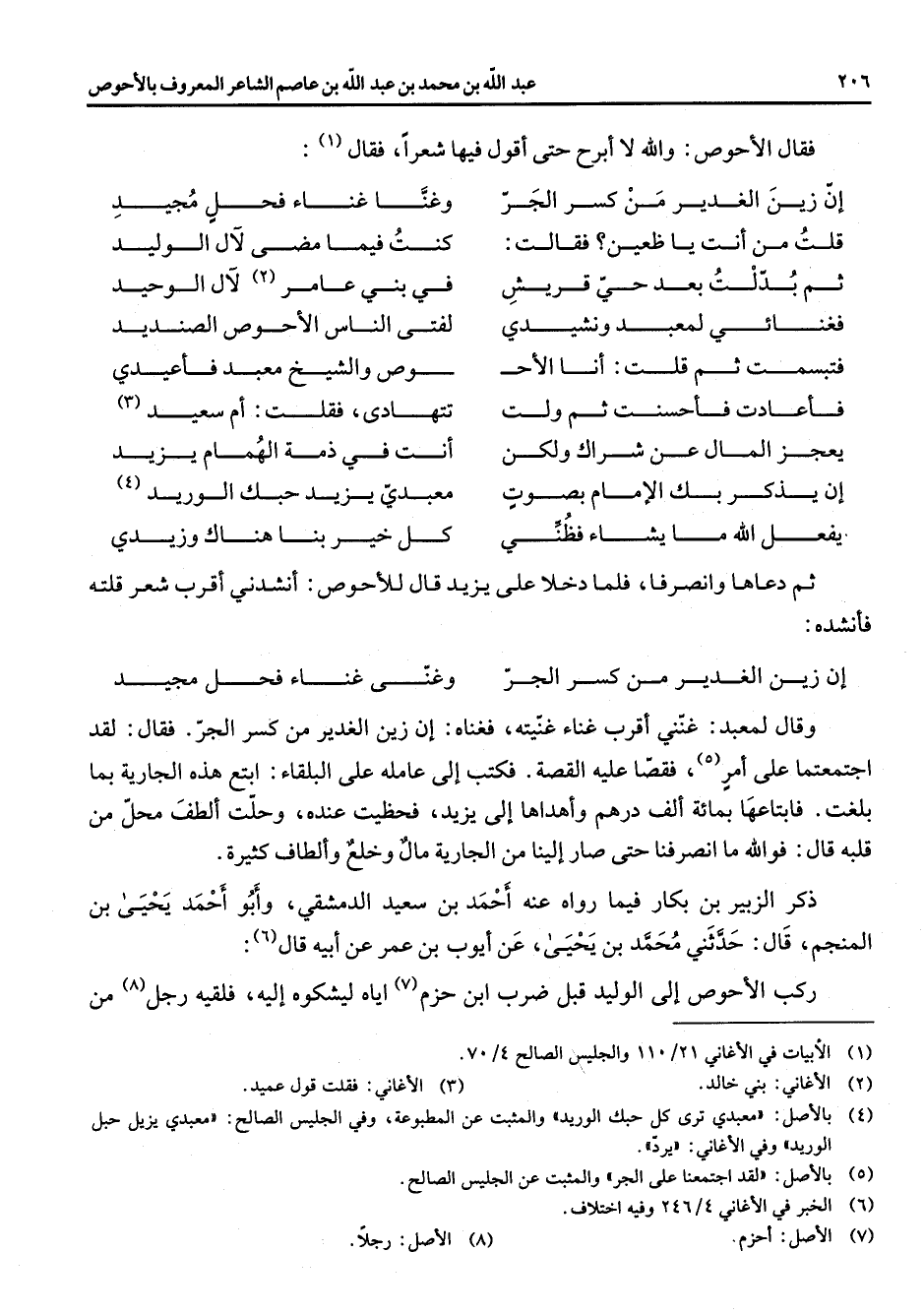 فقال الاحوص والله لا ابرح حتى اقول فيها شعرا فقال (1) أن زين الغدير من كسر الجر * وغنا غناء فحل مجيد قلت من أنت يا ظعين فقالت * كنت فيما مضى لال الوليد ثم بدلت بعد حي قريش * في بني عامر (2) لال الوحيد فغنائي لمعبد ونشيدي * لفتى الناس الاحوص الصنديد فتبسمت ثم قلت أنا الاح * وص والشيخ معبد فأعيدي فأعادت فأحسنت ثم ولت * تتهادى فقلت أم سعيد (3) يعجز المال عن شراك ولكن * أنت في ذمه الهمام يزيد أن يذكر بك الأمام بصوت * معبدي يزيد حبك الوريد (4) يفعل الله ما يشاء فظني * كل خير بنا هناك وزيدي * ثم دعاها وانصرفا فلما دخلا على يزيد قال للأحوص انشدني اقرب شعر قلته فأنشده أن زين الغدير من كسر الجر * وغنى غناء فحل مجيد * وقال لمعبد غنني اقرب غناء غنيته فغناه أن زين الغدير من كسر الجر فقال لقد اجتمعتما على أمر (5) فقصا عليه القصة فكتب إلى عامله على البلقاء ابتع هذه الجارية بما بلغت فابتاعها بمائة ألف درهم وأهداها إلى يزيد فحظيت عنده وحلت الطف محل من قلبه قال فو الله ما انصرفنا حتى صار إلينا من الجارية مال وخلع والطاف كثيرة ذكر الزبير بن بكار فيما رواه عنه احمد بن سعيد الدمشقي وأبو احمد يحيى بن المنجم قال حدثني محمد بن يحيى عن أيوب بن عمر عن أبيه قال (6) ركب الاحوص إلى الوليد قبل ضرب ابن حزم (7) إياه ليشكوه إليه فلقيه رجل (8) من