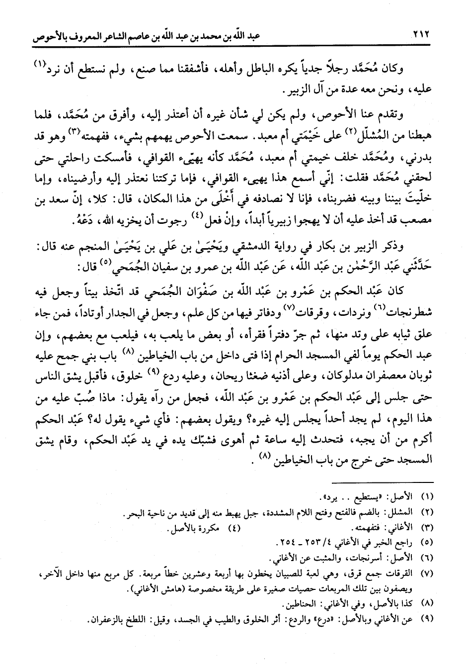 وكان محمد رجلا جديا يكره الباطل واهله فأشفقنا مما صنع ولم نستطع أن نرد (1) عليه ونحن معه عدة من آل الزبير وتقدم عنا الاحوص ولم يكن لي شأن غيره أن اعتذر إليه وافرق من محمد فلما هبطنا من المشلل (2) على خيمتي أم معبد سمعت الاحوص يهمهم بشئ ففهمته (3) وهو قد بدرني ومحمد خلف خيمتي أم معبد محمد كأنه يهيئ القوافي فأمسكت راحلتي حتى لحقني محمد فقلت إني اسمع هذا يهئ القوافي فأما تركتنا نعتذر إليه وارضيناه واما خليت بيننا وبينه فضربناه فأنا لا نصادقه في اخلي من هذا المكان قال كلا أن سعد بن خليت بيننا وبينه فضربناه فإنا لا نصادفه نصادفه في اخلي من هذا المكان قال كلا أن سعد بن مصعب قد اخذ عليه أن لا يهجوا زبيريا أبدا وان فعل (4) رجوت أن يخزيه الله دعه وذكر الزبير بن بكار في رواية الدمشقي ويحيى بن علي بن يحيى المنجم عنه قال حدثني عبد الرحمن بن عبد الله عن عبد الله بن عمرو بن سفيان الجمحي (5) قال كان عبد الحكم بن عمرو بن عبد الله بن صفوان الجمحي قد اتخذ بيتا وجعل فيه شطرنجات (6) ونردات وقرقات (7) ودفاتر فيها من كل علم وجعل في الجدار أوتادا فمن جاء علق ثيابه على وتد منها ثم جر دفترا فقرأه أو بعض ما يلعب به فيلعب مع بعضهم وان عبد الحكم يوما لفي المسجد الحرام إذا فتى داخل من باب الخياطين (8) باب بني جمح عليه ثوبان معصفران مدلو كان وعلى أذنيه ضغثا ريحان وعليه ردع (9) خلوق فأقبل يشق الناس حتى جلس إلى عبد الحكم بن عمرو بن عبد الله فجعل من رآه يقول ماذا صب عليه من هذا اليوم لم يجد أحدا يجلس إليه غيره ويقول بعضهم فأي شئ يقول له عبد الحكم اكرم من أن يحبه فتحدث إليه ساعة ثم أهوى فشبك يده في يد عبد الحكم وقام يشق المسجد حتى خرج من باب الخياطين (8)
