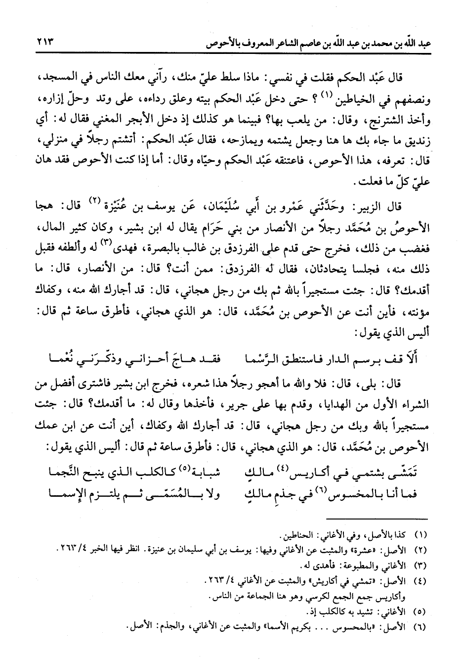قال عبد الحكم فقلت في نفسي ماذا سلط علي منك راني معك الناس في المسجد ونصفهم في الخياطين (1) حتى دخل عبد الحكم بيته وعلق رداءه على وتد وحل ازاره واخذ الشترنج وقال من يلعب بها فبينما هو كذلك إذ دخل الابجر المغني فقال له أي زنديق ما جاء بك ها هنا وجعل يشتمه ويمازحه فقال عبد الحكم اتشتم رجلا في منزلي قال تعرفه هذا الاحوص فاعتنقه عبد الحكم وحياه وقال أما إذا كنت الاحوص فقد هان علي كل ما فعلت قال الزبير وحدثني عمرو بن أبي سليمان عن يوسف بن عنيزة (2) قال هجا الاحوص بن محمد رجلا من الأنصار من بني حرام يقال له ابن بشير وكان كثير المال فغضب من ذلك فخرج حتى قدم على الفرزدق بن غالب بالبصرة فهدى (3) له والطفه فقبل ذلك منه فجلسا يتحادثان فقال له الفرزدق ممن أنت قال من الأنصار قال ما اقدمك قال جئت مستجيرا بالله ثم بك من رجل هجاني قال قد اجارك الله منه وكفاك مؤنته فأين أنت عن الاحوص بن محمد قال هو الذي هجاني فأطرق ساعة ثم قال اليس الذي يقول ألا قف برسم الدار فاستنطق الرسما * فقد هاج احزاني وذكرني نعما * قال بلى قال فلا والله ما اهجوا رجلا هذا شعره فخرج ابن بشير فاشترى افضل من الشراء الأول من الهدايا وقدم بها على جرير فأخذها وقال له ما اقدمك قال جئت مستجيرا بالله وبك من رجل هجاني قال قد اجارك الله وكفاك أين أنت عن ابن عمك الاحوص بن محمد قال هو الذي هجاني قال فأطرق ساعة ثم قال اليس الذي يقول تمشي بشتمي في اكاريس (4) مالك * شبابة (5) كالكلب الذي ينبح النجما فما أنا بالمخسوس (6) في جذم مالك * ولا بالمسمى ثم يلتزم الاسما