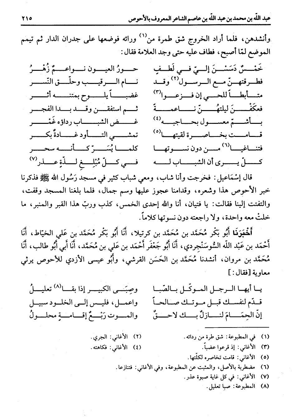 وانشدهن فلما أراد الخروج شق طمرة من (1) ورائه فوضعها على جدران الدار ثم تيمم الموضع لما اصبح فطاف عليه حتى وجد العلامة فقال خمس دسسن الي في لطف * حور العيون نواعم زهر * * فطرقتهن مع الرسول (2) وقد * نام الرقيب وحلق النسر متأبطا للحي إن فزعوا * (3) غضبا يلوح يمتنعه اثر فعكفن ليلتهن ناعمة * ثم استفقن وقد بدا الفجر بأشم معسول بحاجبه (4) * غض الشباب رداؤه غمر قامت بخاصرة لقيتها (5) * تمشي التأود غادة بكر فتناغيا (6) من دون نسوتها * كلما يسر كأنه سحر كل يرى أن الشباب له * في كل مبلغ لذة عذر (7) قال إسماعيل فخرجت وأنا شاب ومعي شباب كثير في مسجد رسول الله (صلى الله عليه وسلم) فذكرنا خير الاحوص هذا وشعره وقدامنا عجوز عليها وسم جمال فلما بلغنا المسجد وقفة والتفتت إلينا فقالت يا فتيان أنا والله إحدى الخمس كذب ورب هذا القبر والمنبر ما خلت معه واحدة ولا راجعته دون نسوتها كلاما أخبرنا أبو بكر محمد بن محمد بن كرتيلا أنا أبو بكر محمد بن علي الخياط أنا احمد بن عبد لله السوسنجردي أنا أبو جعفر احمد بن علي بن محمد أنا أبي أبو طالب أنا محمد بن مروان أنشدنا محمد بن الحسن القرشي وأبو عيسى الازدي للاحوص يرثي معاوية فقال يا أيها الرجل الموكل بالصبا * وصبى الكبير إذا بقا (8) تعليل قدم لنفسك قبل موتك صالحا * واعمل فليس إلى الخلود سبيل إن الحمام لنازل بك لاحق * والموت ربع إقامة محلول
