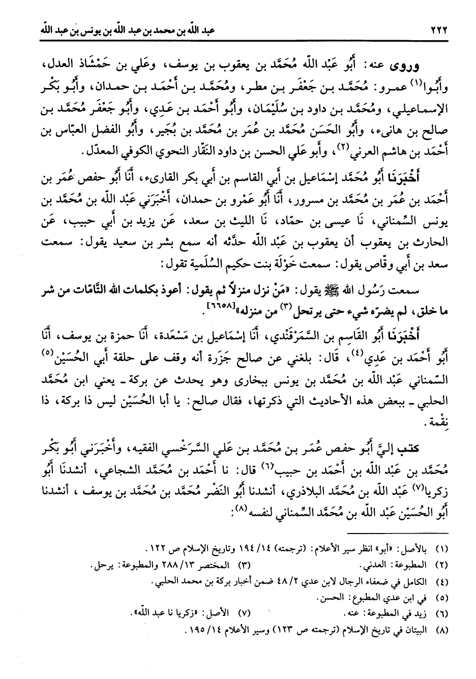 وروى عنه أبو عبد الله محمد بن يعقوب بن يوسف وعلي بن حمشاذ العدل وأبو (1) عمرو محمد بن جعفر بن مطر ومحمد بن احمد بن حمدان وأبو بكر الإسماعيلي ومحمد بن دواد بن سليمان وأبو احمد بن عدي وأبو جعفر محمد بن صالح بن هانئ وأبو علي الحسن محمد بن عمر بن محمد بن بجير وأبو الفضل العباس بن احمد بن هاشم العرني (2) وأبو علي الحسن بن دواد النقار النحوي الكوفي المعدل أخبرنا أبو محمد إسماعيل بن أبي القاسم بن أبي بكر القارئ أنا أبو حفص عمر بن احمد بن عمر بن محمد بن مسرور أنا أبو عمرو بن حمدان اخبرني عبد الله بن محمد بن يونس السمناني نا عيسى بن حماد نا الليث بن سعد عن يزيد بن أبي حبيب عن الحارث بن يعقوب أن يعقوب بن عبد الله حدثه انه سمع بشر بن سعيد يقول سمعت سعد بن أبي وقاص يقول سمعت خولة بنت حكيم السلمية تقول سمعت رسول الله (صلى الله عليه وسلم) يقول من نزل منزلا ثم يقول أعوذ بكلمات الله التامات من شر ما خلق لم يضره شئ حتى يرتحل (3) من منزله أخبرنا أبو القاسم بن السمرقندي أنا إسماعيل بن مسعدة أنا حمزة بن يوسف أنا أبو احمد بن عدي (4) قال بلغني عن صالح جزره انه وقف على حلقة أبي الحسين (5) السماني عبد الله محمد بن يونس ببخاري وهو يحدث عن بركة يعني ابن محمد الحلبي ببعض هذه الأحاديث التي ذكرتها فقال صالح يا أبا الحسين ليس ذا بركة ذا نقمة كتب الي أبو حفص عمر بن محمد بن علي السرخسي الفقيه واخبرني أبو بكر محمد بن عبد الله بن احمد بن حبيب (6) قال نا احمد بن محمد الشجاعي أنشدنا أبو زكريا (7) عبد الله بن محمد البلاذري أنشدنا أبو النصر محمد بن محمد بن يوسف أنشدنا أبو الحسين عبد الله بن محمد السمناني لنفسه (8)