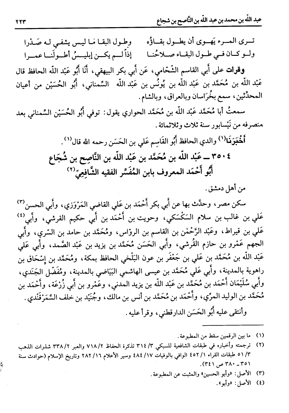 ترى المرء يهوى أن يطول بقاؤه * وطول البقا ما ليس يشفي له صدرا ولو كان في طول البقاء صلاحنا * إذا لم يكن إبليس اطولنا عمرا * وقرأت على أبي القاسم الشحامي عن أبي بكر البهيقي أنا أبو عبد الله الحافظ قال عبد الله بن محمد بن عبد الله بن يونس بن عبد الله السمناني أبو الحسين من اعيان المحدثين سمع بخراسان وبالعراق وبالشام سمعت أبا محمد عبد الله بن محمد الحواري يقول توفي أبو الحسين السمناني بعد منصرفه من نيسابور سنة ثلاث وثلاثمائة أخبرنا (1) والدي الحافظ أبو القاسم علي بن الحسن رحمه الله قال (1)