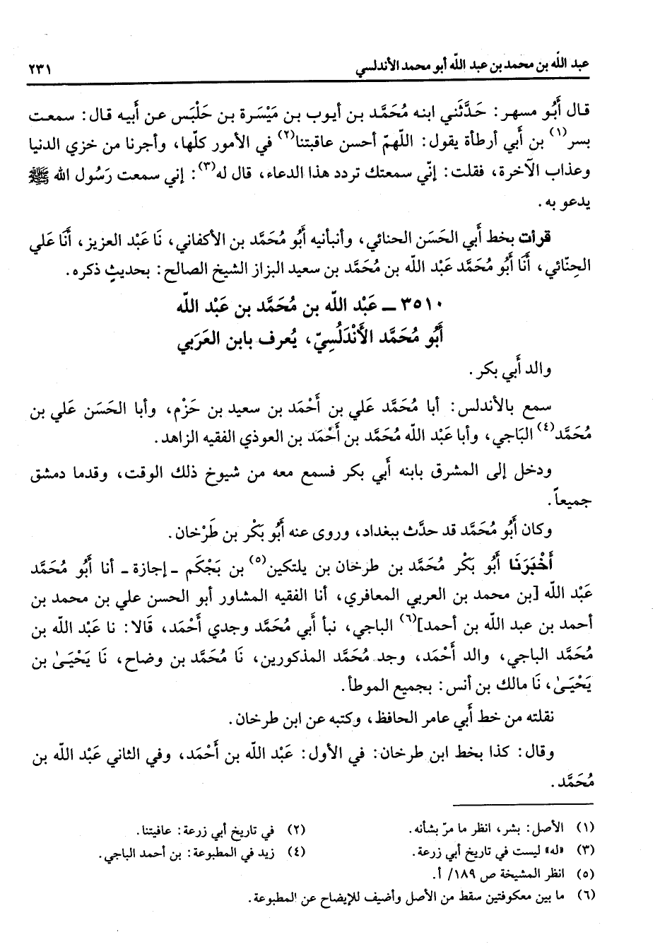 قال أبو مسهر حدثني ابنه محمد بن أيوب بن ميسرة بن حلبس عن أبيه قال سمعت بسر (1) بن أبي أرطأة يقول اللهم احسن عاقبتنا (2) في الأمور كلها واجرنا من خزي الدنيا وعذاب الآخرة فقلت أني سمعتك تردد هذا الدعاء قال له (3) أني سمعت رسول الله (صلى الله عليه وسلم) يدعو به قرأت بخط أبي الحسن الحنائي وأنبانيه أبو محمد بن الأكفاني نا عبد العزيز أنا علي الحنائي أنا أبو محمد عبد الله بن محمد بن سعيد البزار الشيخ الصالح بحديث ذكره 3510 (عبد الله بن محمد بن عبد الله أبو محمد الاندلسي يعرف بابن العربي والد أبي بكر سمع بالأندلس أبا محمد علي بن احمد بن سعيد بن حزم وأبا الحسن علي بن محمد (4) الباجي وأبا عبد الله محمد بن احمد بن العوذي الفقيه الزاهد ودخل إلى المشرق بابنه أبي بكر فسمع معه من شيوخ ذلك الوقت وقدما دمشق جميعا وكان أبو محمد قد حدث ببغداد وروى عنه أبو بكر بن طرخان أخبرنا أبو بكر محمد بن طرخان بن يلتكن (5) بن بجكم إجازة أنا أبو محمد عبد الله بن محمد بن العربي المعافري أنا الفقيه المشاور أبو الحسن علي بن محمد بن احمد بن عبد الله بن احمد (6) الباجي نبأ أبي محمد وجدي احمد قالا نا عبد الله بن محمد الباجي والد احمد وجد محمد المذكورين نا محمد بن وضاح نا يحيى بن يحيى نا مالك بن انس بجميع الموطأ نقلته من خط أبي عامر الحافظ وكتبه عن ابن طرخان وقال كذا بخط ابن طرخان في الأول عبد الله بن احمد وفي الثاني عبد الله بن محمد
