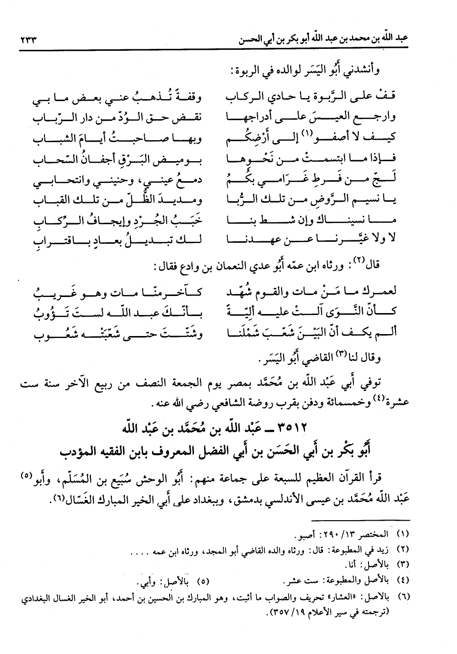 وانشدني أبو اليسر لوالده في الربوة قف على الربوة يا حادي الركاب * وقفة تذهب عني بعض ما بي وارجع العيس على أدراجها * نقض حق الود من دار الرباب كيف لا أصفو (1) إلى أرضكم * وبها صاحبت أيام الشباب فإذا ما ابتسمت من نحوها * بوميض البرق أجفان السحاب لج من فرط غرامي بكم * دمع عيني وحنيني وانتحابي يا نسيم الروض من تلك الربا * ومديد الظل من تلك القباب ما نسيناك وان شط بنا * خبب الجرد وايجاف الركاب لا ولا غيرنا عن عهدنا * لك تبديل بعاد باقتراب * قال (2) ورثاه ابن عمه أبو عدي النعمان بن وادع فقال لعمرك ما من مات والقوم شهد * كآخر منا مات وهو غريب كأن النوى الت عليه الية * بأنك عبد الله لست تؤوب ألم يكف أن البين شعب شملنا * وشتت حتى شعبته شعوب وقال لنا (3) القاضي أبو اليسر توفي أبي عبد الله بن محمد بمصر يوم الجمعة النصف من ربيع الآخر سنة ست عشرة (4) وخمسمائة ودفن بقرب روضة الشافعي Bهـ