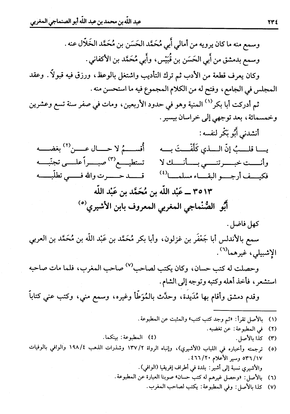 3513 - عبد الله بن محمد بن عبد الله أبو الصنماجي المغربي المعروف بابن الاشيري (5) كهل فاضل سمع بالأندلس أبا جعفر بن عزلون وأبا بكر محمد بن عبد الله بن محمد بن العربي الاشبيلي غيرهما (6) وحصلت له كتب حسان وكان يكتب لصاحب (7) صاحب المغرب فلما مات صاحبه استشعر فأخذ أهله وكتبه وتوجه إلى الشام وقدم دمشق واقام بها مديدة وحدث بالموطأ وغيره وسمع مني وكتب عني كتابا