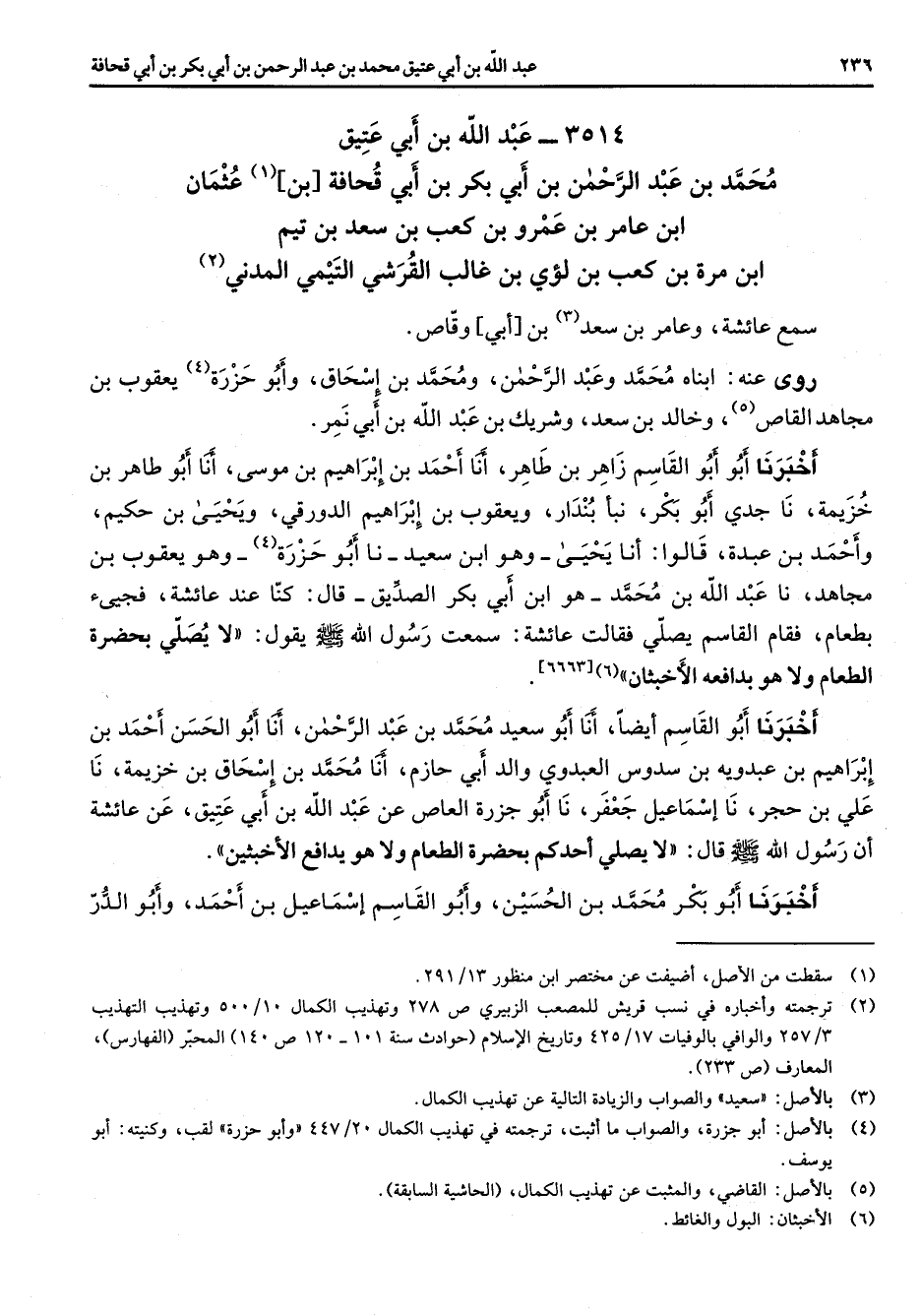 3514 - عبد الله بن أبي عتيق محمد بن عبد الرحمن بن أبي بكر بن أبي قحافة بن (1) عثمان ابن عامر بن عمرو بن كعب بن سعد بن تيم ابن مرة بن كعب بن لؤي بن غالب القرشي التيمي المدني (2) سمع عائشة وعامر بن سعد (3) بن أبي وقاص روى عنه ابناه محمد وعبد الرحمن ومحمد بن إسحاق وأبو حزرة (4) يعقوب بن مجاهد القاص وخالد بن سعد وشريك بن عبد الله بن أبي نمر أخبرنا أبو القاسم زاهر بن طاهر أنا احمد بن إبراهيم بن موسى أنا أبو طاهر بن خزيمة نا جدي أبو بكر نبأ بندار ويعقوب بن إبراهيم الدورقي ويحيى بن حكيم واحمد بن عبدة قالوا أنا يحيى وهو ابن سعد نا أبو حزرة (5) وهو يعقوب بن مجاهد نا عبد الله بن محمد هو ابن أبي بكر الصديق قال كنا عند عائشة فجيئ بطعام فقام القاسم يصلي فقالت عائشة سمعت رسول الله (صلى الله عليه وسلم) يقول لا يصلي بحضرة الطعام ولا وهو بدافعه الاخبثان 6 أخبرنا أبو القاسم أيضا أنا أبو سعيد محمد بن عبد الرحمن أنا أبو الحسن احمد بن إبراهيم بن عبدويه بن سدوس العبدوي والد أبي حازم أنا محمد بن إسحاق بن خزيمة نا علي بن حجر نا إسماعيل جعفر نا أبو جزرة العاص عن عبد الله بن أبي عتيق عن عائشة أن رسول الله (صلى الله عليه وسلم) قال لا يصلي أحدكم بحضرة الطعام ولا هو يدافع الاخبثين أخبرنا أبو بكر محمد بن الحسين وأبو القاسم إسماعيل بن احمد وأبو الدر