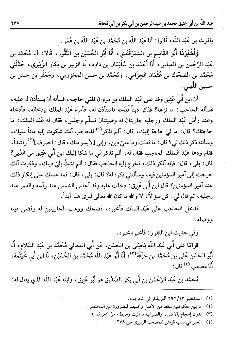 ياقوت بن عبد الله قالوا أنا عبد الله بن محمد بن عبد الله بن عمر وأخبرنا أبو القاسم بن السمرقندي أنا أبو الحسين بن النقور قالا أنا محمد بن عبد الرحمن بن العباس أنا احمد بن سليمان بن داود نا الزبير بن بكار الزبيري حدثني محمد بن الضحاك بن عثمان الحزامي ومحمد بن حسن المخزومي وجعفر بن حسن بن حسين اللهبي أن ابن أبي عتيق وفد على عبد الملك بن مروان فلقي حاجبه فسأله أن يستأذن له عليه فسأله الحاجب ما نزعه فذكر دينا فدحه فاستأذن له فأمره عبد الملك بإدخاله فأدخله وعند رأس عبد الملك ورجليه جاريتان له وضيئتان فسلم وجلس فقال له عبد الملك ما حاجتك قال ما لي حاجة إليك قال ألم تذكر (1) للحاجب انك شكوت إليه دينا عليك وسألته ذكر ذلك لي قال ما فعلت وما علي دين واني لأيسر منك قال انصرف (2) راشدا فقام ودعا عبد الملك الحاجب فقال له ألم تذكر لي ما شكا إليك ابن أبي عتيق من الدين قال بلى قال فانه انكر ذلك فخرج إليه الحاجب فقال آلم تشك إلي دينك وذكرت انك خرجت إلى أمير المؤمنين فيه وسألتني ذكره له قال بلى فما حملك على انكار ذلك عند أمير المؤمنين قال ابن أبي عتيق دخلت عليه وقد اجلس الشمس عند رأسه والقمر عند رجليه ثم قال لي كن سؤالا لا والله ما كان الله تعالى ليرى هذا أبدا فدخل الحاجب على عبد الملك فأخبره فضحك ووهب الجاريتين له وقضى دينه ووصله وفي حديث ابن النقور فأخبره خبره قرأنا علي أبي عبد الله يحيى بن الحسن عن أبي المعالي محمد بن عبد السلام أنا أبو الحسن علي بن محمد بن خزفة (3) أنا أبو عبد الله محمد بن الحسين نا ابن أبي خيثمة أنا مصعب (4) قال محمد بن عبد الرحمن بن أبي بكر الصديق هو أبو عتيق وابنه عبد الله الذي يقال له