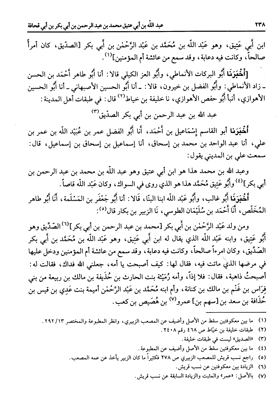 ابن أبي عتيق وهو عبد الله بن محمد بن عبد الرحمن بن أبي بكر الصديق كان أمرا صالحا (1) وكانت فيه دعابة وقد سمع من عائشة أم المؤمنين أخبرنا أبو البركات الانماطي وأبو العز الكيلي قالا أنا أبو طاهر احمد بن الحسن زاد الانماطي وأبو الفضل بن خيرون قالا أنا أبو الحسين الاصبهاني أنا أبو الحسين الاهوازي أنبأ أبو حفص الاهوازي نا خليفة بن خياط (2) قال في طبقات أهل المدينة عبد الله بن عبد الرحمن بن أبي بكر الصديق (3) أخبرنا أبو القاسم إسماعيل بن احمد أنا أبو الفضل عمر بن عبيد الله بن عمر بن علي أنا عبد الواحد بن محمد بن إسحاق أنا إسماعيل بن إسحاق بن إسماعيل قال سمعت علي بن المديني يقول وعبد الله بن محمد هذا هو ابن أبي عتيق وهو عبد الله بن محمد بن عبد الرحمن بن أبي بكر (4) وأبو عتيق محمد هذا هو الذي روى في السواك وكان عبد الله قاصا أخبرنا أبو غالب وأبو عبد الله ابنا البنا قالا أنا أبو جعفر بن المسلمة أنا أبو طاهر المخلص أنا احمد بن سليمان الطوسي نا الزبير بن بكار (5) قال ومن ولد عبد الرحمن بن أبي بكر محمد بن عبد الرحمن بن أبي بكر (6) الصديق وهو أبو عتيق وابنه عبد الله يقال له ابن أبي عتيق وهو عبد الله بن محمد بن أبي بكر الصديق وكان امرءا صالحا وكانت فيه دعابة وقد سمع من عائشة أم المؤمنين ودخل عليها في مرضها الذي ماتت فيه فقال لها كيف أصبحت يا أمه جعلني الله فداك فقالت له أصبحت ذاهبة فقال فلا إذا وأمه رميثة بنت الحارث بن حذيفة بن مالك بن ربيعة من بني فراس بن غنم بن مالك بن كنانة وأم ابنه محمد بن عبد الرحمن اميمة بنت عدي بن قيس بن حذافة بن سعد بن سهم بن عمرو (7) بن هصيص بن كعب