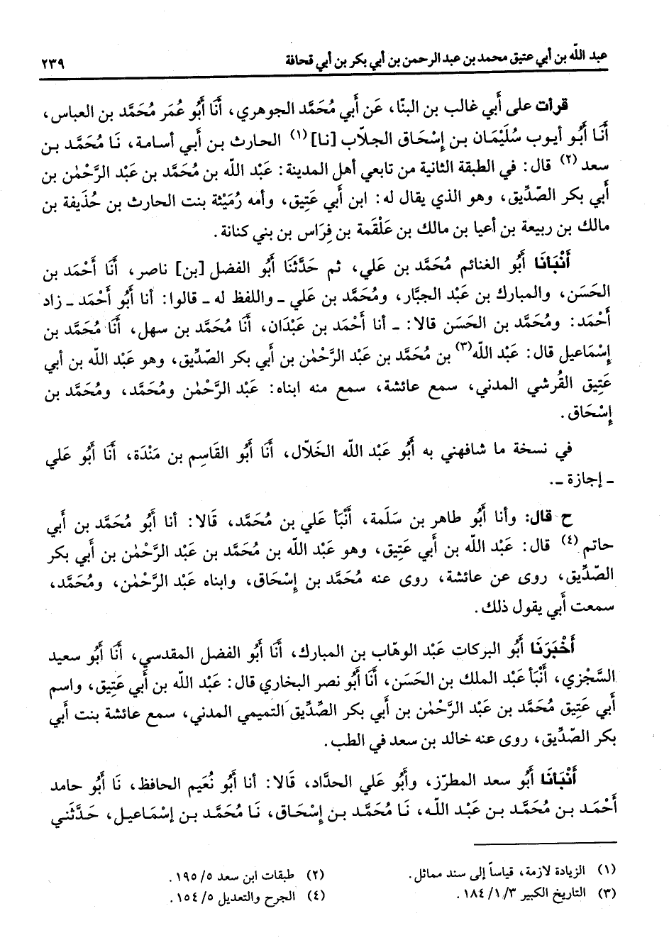 قرأت على أبي غالب بن البنا عن أبي محمد الجوهري أنا أبو عمر محمد بن العباس أنا أبو أيوب سليمان بن إسحاق الجلاب نا (1) الحارث بن أبي أسامة نا محمد بن سعد (2) قال في الطبقة الثانية من تابعي أهل المدينة عبد الله بن محمد بن عبد الرحمن بن أبي بكر الصديق وهو الذي يقال له ابن أبي عتيق وأمه رميثه بنت الحارث بن حذيفة بن مالك بن ربيعة بن اعيا بن مالك بن علقمة بن فراس بن بني كنانة أنبأنا أبو الغنائم محمد بن علي ثم حدثنا أبو الفضل بن ناصر أنا احمد بن الحسن والمبارك بن عبد الجبار ومحمد بن علي واللفظ له قالوا أنا أبو احمد زاد احمد ومحمد بن الحسن قالا أنا احمد بن عبدان أنا محمد بن سهل أنا محمد بن إسماعيل قال عبد الله (3) بن محمد بن عبد الرحمن بن أبي بكر الصديق وهو عبد الله بن أبي عتيق القرشي المدني سمع عائشة سمع منه ابناه عبد الرحمن ومحمد ومحمد بن إسحاق في نسخة ما شافهني به أبو عبد الله الخلال أنا أبو القاسم بن مندة أنا أبو علي إجازة ح قال وأنا أبو طاهر بن سلمة أنبأ علي بن محمد قالا أنا أبو محمد بن أبي حاتم (4) قال عبد الله بن أبي عتيق وهو عبد الله بن أبي عتيق وهو عبد الله بن محمد بن عبد الرحمن بن أبي بكر الصديق روى عن عائشة روى عنه محمد بن إسحاق وابناه عبد الرحمن ومحمد سمعت أبي يقول ذلك أخبرنا أبو البركات عبد الوهاب بن المبارك أنا أبو الفضل المقدسي أنا أبو سعيد السجزي أنبأ عبد الملك بن الحسن أنا أبو نصر البخاري قال عبد الله بن أبي عتيق واسم أبي عتيق محمد بن عبد الرحمن بن أبي بكر الصديق التميمي المدني سمع عائشة بنت أبي بكر الصديق روى عنه خالد بن سعد في الطب أنبأنا أبو سعد المطرز وأبو علي الحداد قالا أنا أبو نعيم الحافظ نا أبو حامد احمد بن محمد بن عبد الله نا محمد بن إسحاق نا محمد بن إسماعيل حدثني