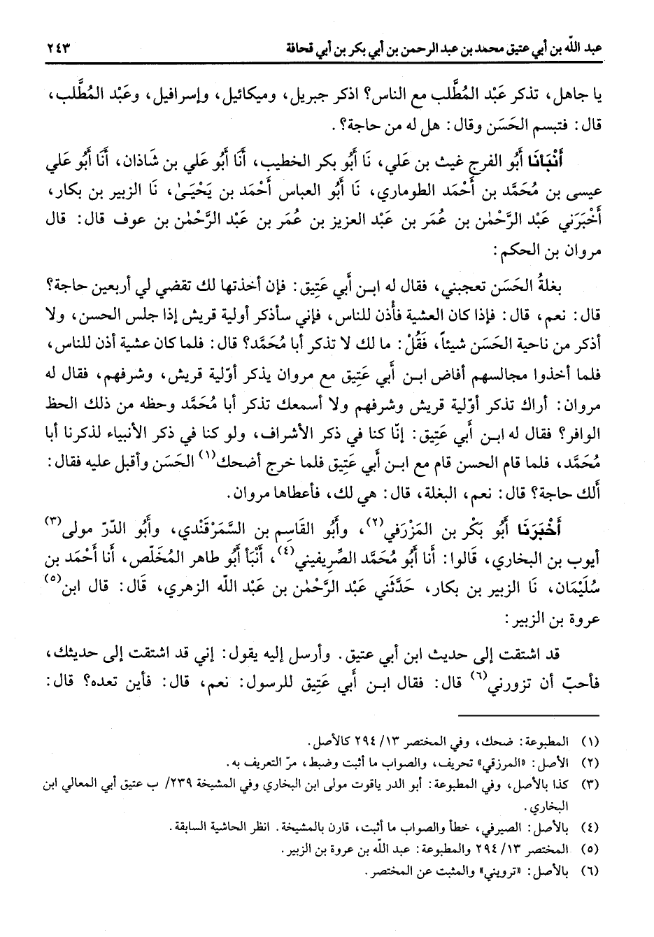 يا جاهل تذكر عبد المطلب مع الناس اذكر جبريل وميكائيل واسرافيل وعبد المطلب قال فبتسم الحسن وقال هل له من حاجة أنبأنا أبو الفرج غيث بن علي نا أبو بكر الخطيب أنا أبو علي بن شاذان أنا أبو علي عيسى بن محمد بن احمد الطوماري نا أبو العباس احمد بن يحيى نا الزبير بن بكار اخبرني عبد الرحمن بن عمر بن عبد العزيز بن عمر بن عبد الرحمن بن عوف قال قال مروان بن الحكم بغلة الحسن تعجبني فقال له ابن أبي عتيق فان اخذتها لك تقضي لي أربعين حاجة قال نعم قال فإذا كان العشية فأذن للناس فاني سأذكر أولية قريش إذا جلس الحسن ولا اذكر من ناحية الحسن شيئا فقل ما لك لا تذكر أبا محمد قال فلما كان عشية أذن للناس فلما اخذوا مجالسهم افاض ابن أبي عتيق مع مروان يذكر أولية قريش وشرفهم فقال له مروان أراك تذكر أولية قريش وشرفهم ولا اسمعك تذكر أبا محمد وحظه من ذلك الحظ الوافر فقال له ابن أبي عتيق أنا كنا في ذكر الاشراف ولو كنا في ذكر الأنبياء لذكرنا أبا محمد فلما قام الحسن قام مع ابن أبي عتيق فلما خرج اضحك (1) الحسن واقبل عليه فقال الك حاجة قال نعم البغلة قال هي لك فأعطاها مروان أخبرنا أبو بكر بن المزرفي (2) وأبو القاسم بن السمرقندي وأبو الدر مولى (3) أيوب بن البخاري قالوا أنا أبو محمد الصريفيني (4) أنبأ أبو طاهر المخلص أنا احمد بن سليمان نا الزبير بن بكار حدثني عبد الرحمن بن عبد الله الزهري قال قال ابن (5) عروة بن الزبير قد اشتقت إلى حديث ابن أبي عتيق وارسل إليه يقول إني قد اشتقت إلى حديثك فأحب أن تزورني (6) قال فقال ابن أبي عتيق للرسول نعم قال فأين تعده قال