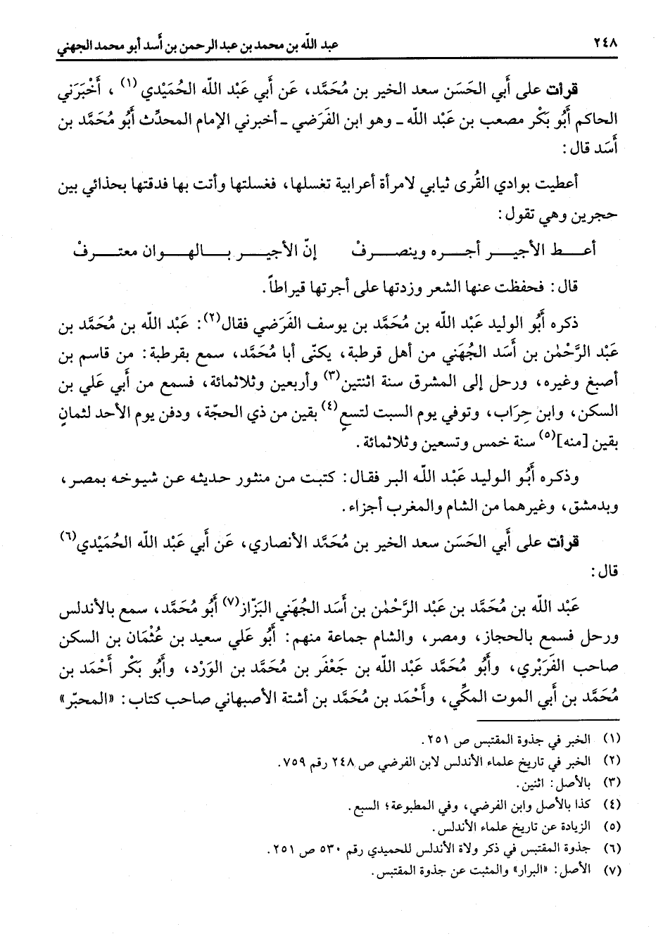 قرأت على أبي الحسن سعد الخير بن محمد عن أبي عبد الله (1) الحميدي اخبرني الحاكم أبو بكر مصعب بن عبد الله وهو ابن الفرضي اخبرني الأمام المحدث أبو محمد بن أسد قال اعطيت بوادي القرى ثيابي لأمرأة اعرابية تغسلها فغسلتها واتت بها فدقتها بحذائي بين حجرين وهي تقول اعط الاجير اجره وينصرف * أن الاجير بالهوان معترف * قال فحفظت عنها الشعر وزدتها على اجرتها قيراطا ذكره أبو الوليد عبد الله بن محمد بن يوسف الفرضي فقال (2) عبد الله بن محمد عبد الرحمن بن أسد الجهني من وأهل قرطبة يكنى أبا محمد سمع بقرطبة من قاسم بن اصبغ وغيره ورحل إلى المشرق سنة اثنتين (3) واربعين وثلاثمائة فسمع من أبي علي بن السكن وابن حراب وتوفي يوم السبت لتسع (4) بقين من ذي الحجة ودفن يوم الاحد لثمان بقين منه (5) سنة خمس وتسعين وثلاثمائة وذكره أبو الوليد عبد الله البر فقال كتبت من منثور حديثه عن شيوخه بمصر وبدمشق وغيرهما من الشام والمغرب أجزاء قرأت على أبي الحسن سعد الخير بن محمد الأنصاري عن أبي عبد الله الحميدي (6) قال عبد الله بن محمد بن عبد الرحمن بن أسد الجهني البزار (7) أبو محمد سمع بالأندلس ورحل فسمع بالحجاز ومصر والشام جماعة منهم أبو علي سعيد بن عثمان بن السكن صاحب الفربري وأبو محمد عبد الله بن جعفر بن محمد بن الورد وأبو بكر احمد بن محمد بن أبي الموت المكي واحمد بن محمد بن اشنة الاصبهاني صاحب كتاب المحبر