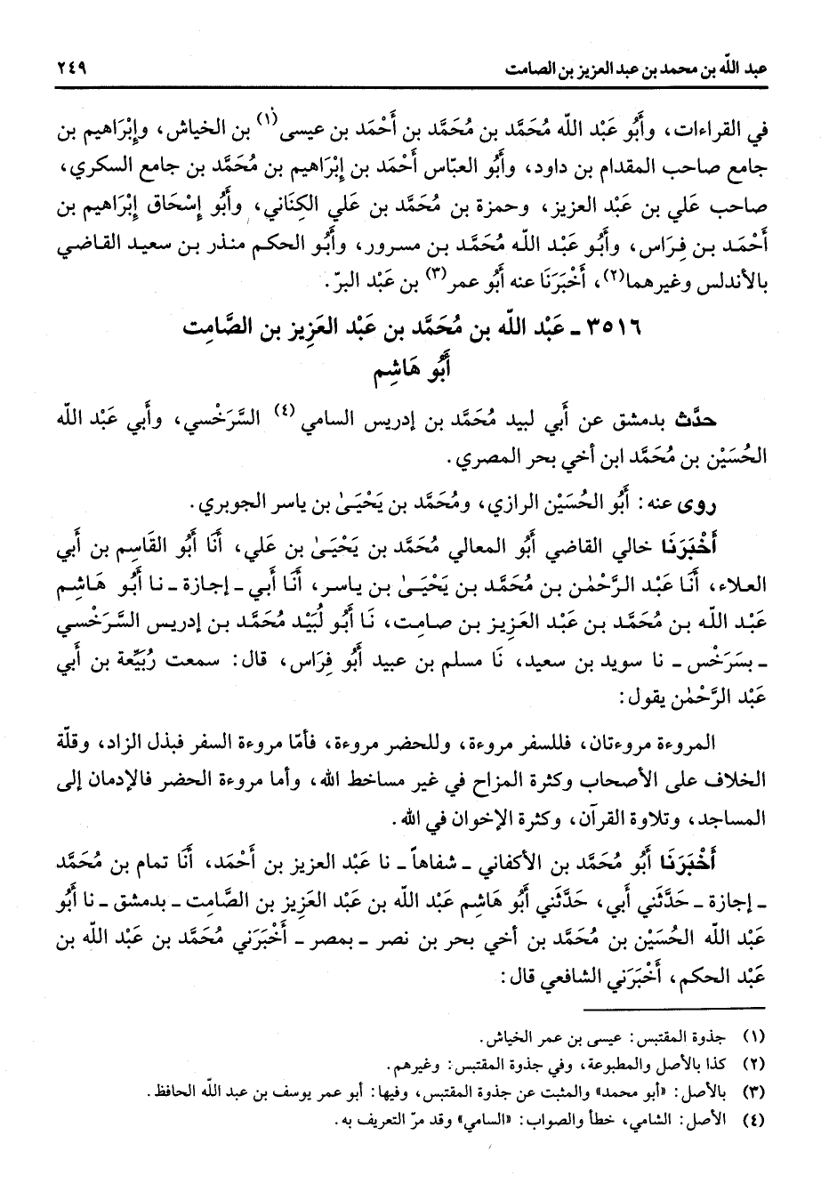 3516 - عبد الله بن محمد بن عبد العزيز بن الصامت أبو هاشم حدث بدمشق عن أبي لبيد محمد بن إدريس السامي (4) السرخسي وأبي عبد الله الحسين بن محمد ابن أخي بحر المصري روى عنه أبو الحسين الرازي ومحمد بن يحيى بن ياسر الجوبري أخبرنا خالي القاضي أبو المعالي محمد بن يحيى بن علي أنا أبو القاسم بن أبي العلاء أنا عبد الرحمن بن محمد بن يحيى بن ياسر أنا أبي إجازة نا أبو هاشم عبد الله بن محمد بن عبد العزيز بن صامت نا أبو الوليد لبيد محمد بن إدريس السرخسي بسرخس نا سويد بن سعيد نا مسلم بن عبيد أبو فراس قال سمعت ربيعة بن أبي عبد الرحمن يقول المروءة مروءتان فللسفر مروءة وللحضر مروءة فأما مروءة السفر فبذل الزاد وقلة الخلاف على الاصحاب وكثرة المزاح في غير مساخط الله واما مروءة الحضر فلأدمان إلى المساجد وتلاوة القران وكثرة الاخوان في الله أخبرنا أبو محمد بن الأكفاني شفاها نا عبد العزيز بن احمد أنا تمام بن محمد إجازة حدثني أبي حدثني أبو هاشم عبد الله بن عبد العزيز بن الصامت بدمشق نا أبو عبد الله الحسين بن محمد بن أخي بحر بن نصر بمصر اخبرني محمد بن عبد الله بن عبد الحكم اخبرني الشافعي قال