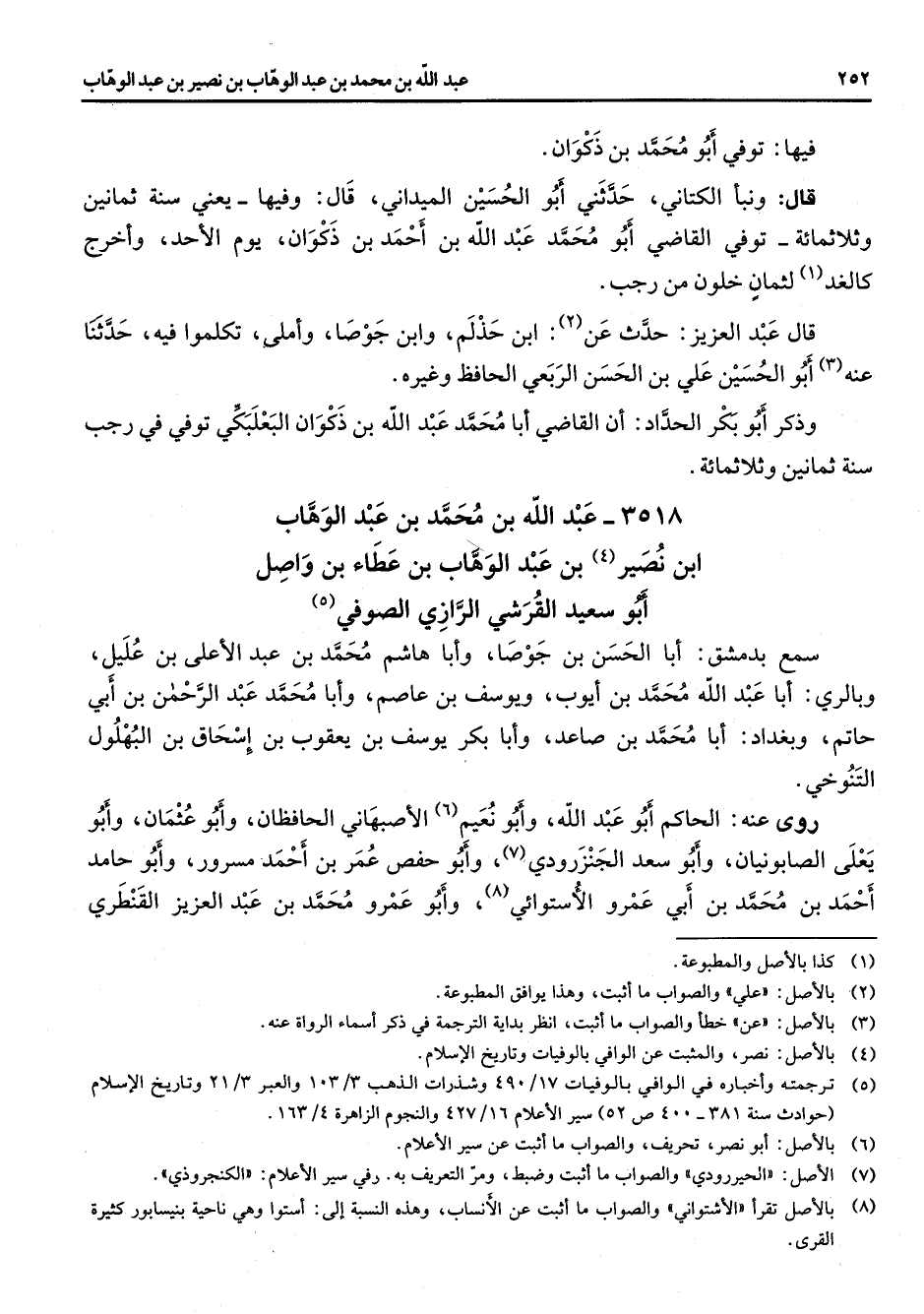 3518 - عبد الله بن محمد بن عبد الوهاب ابن نصير (4) بن عبد الوهاب بن عطاء بن واصل أبو سعيد القرشي الرازي الصوفي (5) سمع بدمشق أبا الحسن بن جوصا وأبا هاشم محمد بن عبد الأعلى بن عليل وبالري أبا عبد الله محمد بن أيوب ويوسف بن عاصم وأبا محمد عبد الرحمن بن أبي حاتم وبغداد أبا محمد بن صاعد وأبا بكر يوسف بن يعقوب بن إسحاق بن البهلول التنوخي روى عنه الحاكم أبو عبد الله وأبو نعيم (6) الاصبهاني الحافظان وأبو عثمان وأبو يعلى الصابونيان وأبو سعد الجنزرودي (7) وأبو حفص عمر بن احمد مسرور وأبو حامد احمد بن محمد بن أبي عمرو الاستوائي (8) وأبو عمرو محمد بن عبد العزيز القنطري