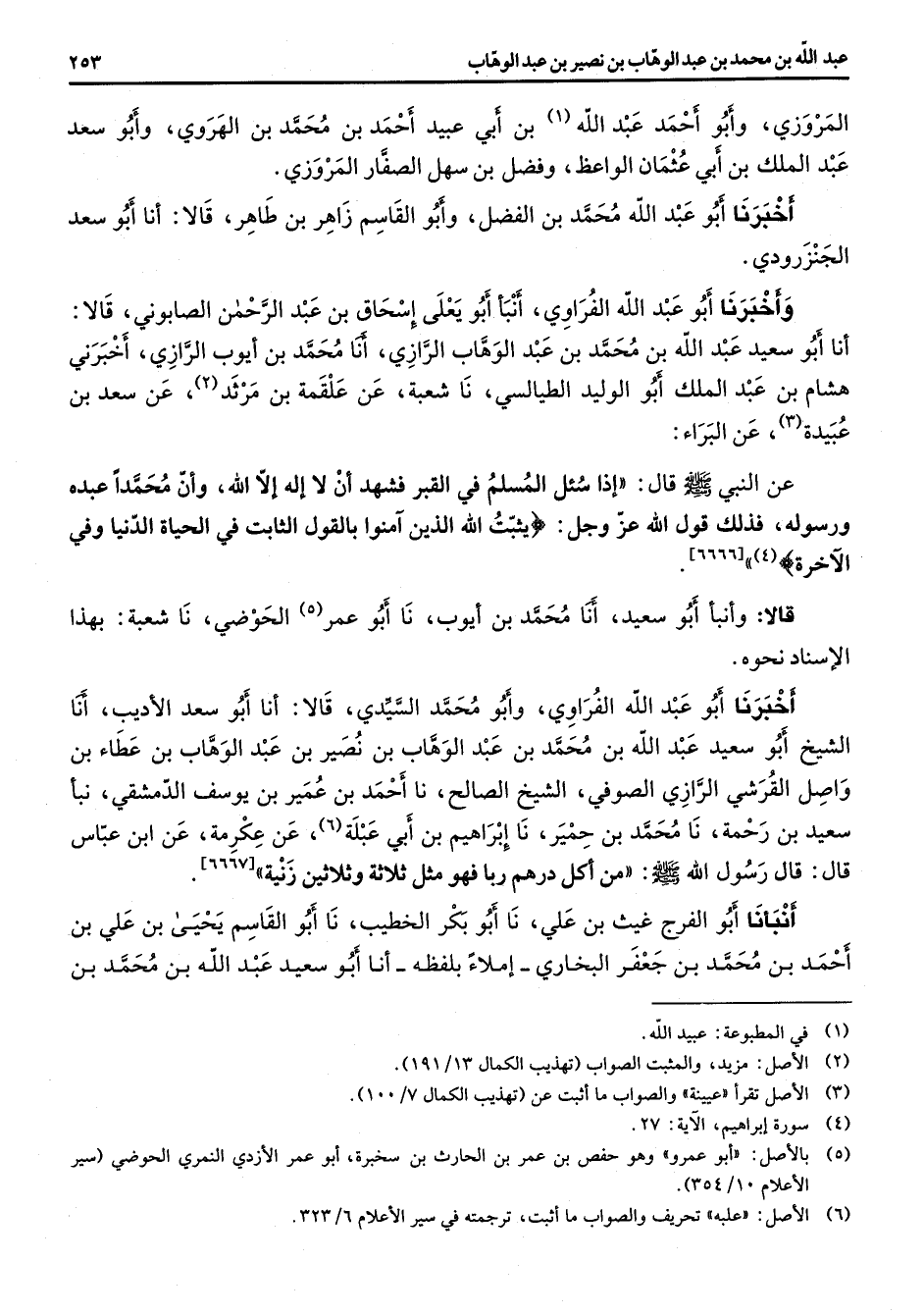 المروزي وأبو احمد عبد الله (1) بن أبي عبيد احمد بن محمد بن الهروي وأبو سعد عبد الملك بن أبي عثمان الواعظ وفضل بن سهل الصفار المروزي أخبرنا أبو عبد الله محمد بن الفضل وأبو القاسم زاهر بن طاهر قالا أنا أبو سعد الجنزرودي وأخبرنا أبو عبد الله الفراوي أنبأ أبو يعلى إسحاق بن عبد الرحمن الصابوني قالا أنا أبو سعيد عبد الله بن محمد بن عبد الوهاب الرازي أنا محمد بن أيوب الرازي اخبرني هشام بن عبد الملك الوليد أبو الوليد الطيالسي نا شعبة عن علقمة بن مرثد (2) عن سعد بن عبيدة (3) عن البراء عن النبي (صلى الله عليه وسلم) قال إذا سئل المسلم في القبر فشهد أن لا اله إلا الله وان محمدا عبده ورسوله فذلك قول الله عز وجل " يثبت الله الذين امنوا بالقول الثابت في الحياة الدنيا وفي الآخرة " (4) قالا أنبأ أبو سعيد أنا محمد بن أيوب نا أبو عمر (5) الحوضي نا شعبة بهذا الإسناد نحوه أخبرنا أبو عبد الله الفراوي وأبو محمد السيدي قالا أنا أبو سعد الأديب أنا الشيخ أبو سعيد عبد الله بن محمد بن عبد الوهاب بن نصير بن عبد الوهاب بن عطاء بن واصل القرشي الرازي الصوفي الشيخ الصالح نا احمد بن عمير بن يوسف الدمشقي نبأ سعيد بن رحمة نا محمد بن حمير نا إبراهيم بن أبي عبلة (6) عن عكرمة عن ابن عباس قال قال رسول الله (صلى الله عليه وسلم) من أكل درهم ربا فهو مثل ثلاثة وثلاثين زنية أنبأنا أبو الفرج غيث بن علي نا أبو بكر الخطيب نا أبو القاسم يحيى بن علي بن احمد بن محمد بن جعفر البخاري إملاء بلفظه أنا أبو سعيد عبد الله بن محمد بن