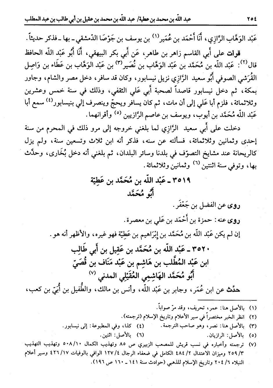 عبد الوهاب الرازي أنا احمد بن عمير (1) بن يوسف بن جوصا الدمشقي بها فذكر حديثا قرأت على أبي القاسم زاهر بن طاهر عن أبي بكر البيهقي أنا أبو عبد الله الحافظ قال (2) عبد الله بن محمد بن عبد الوهاب بن نصير (3) بن عبد الوهاب بن عطاء بن واصل القرشي الصوفي أبو سعيد الرازي نزيل نيسابور وكان قد سافر دخل مصر والشام وجاور بمكة ثم دخل نيسابور قاصدا لصحبة أبي علي الثقفي وذلك في سنة خمس وعشرين وثلاثمائة فلزم أبا علي إلى أن مات ثم كان يسافر ويحج وينصرف الي نيسابور (4) سمع أبا عبد الله محمد بن أيوب ويوسف بن عاصم الرازيين (5) واقرانهما دخلت على أبي سعيد الرازي لما بلغني خروجه إلى مرو ذلك في المحرم من سنة إحدى وثمانين وثلاثمائة فسألته عن سنه فذكر انه ابن ثلاث وتسعين سنة ولم يزل كالريحانة عند مشايخ التصوف في بلدنا وسائر البلدان ثم بلغني انه دخل بخارى وحدث بها وتوفي في سنة اثنتين (6) وثمانين وثلاثمائة 3519 عبد الله بن محمد بن عطية أبو محمد روى عنه الفضل بن جعفر روى عنه الثوري حمزة بن احمد بن علي بن معصرة أن لم يكن عبد الله بن محمد بن إبراهيم بن عطية فهو غيره والأظهر انه هو 3520 (عبد الله بن محمد بن عقيل بن أبي طالب ابن عبد المطلب بن هاشم بن عبد مناف بن قصي أبو محمد الهاشمي العقيلي المدني (7) حدث عن ابن عمر وجابر بن عبد الله وانس بن مالك والطفيل بن أبي بن كعب