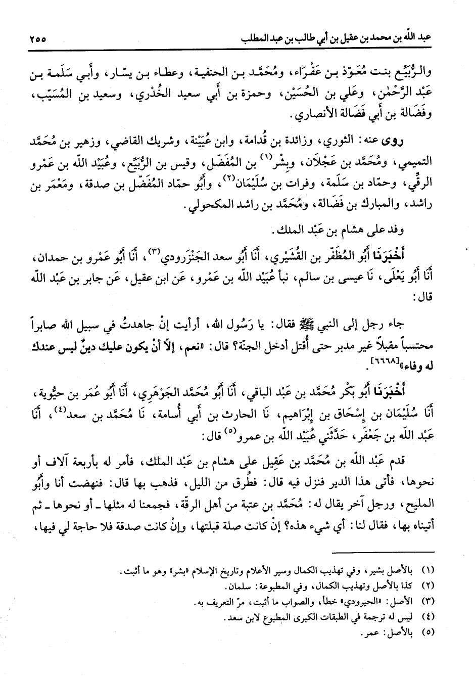 والربيع بنت معوذ بن عفراء ومحمد بن الحنفية وعطاء بن يسار وأبي سلمة بن عبد الرحمن وعلي بن الحسين وحمزة بن أبي سعيد الخدري وسعيد بن المسيب وفضالة بن أبي فضالة الأنصاري روى عنه الثوري وزائدة بن قدامة وابن عيينة وشريك القاضي وزهير بن محمد التميمي ومحمد بن عجلان وبشر (1) بن المفضل وقيس بن الربيع وعبيد الله بن عمرو الرقي وحماد بن سلمة وفرات بن سليمان (2) وأبو حماد المفضل بن صدقة ومعمر بن راشد والمبارك بن فضالة ومحمد بن راشد المكحولي وفد على هشام بن عبد الملك أخبرنا أبو المظفر بن القشيري أنا أبو سعد الجنزوردي (3) أنا أبو عمرو بن حمدان أنا أبو يعلى نا عيسى بن سالم نبأ عبيد الله بن عمرو عن ابن عقيل عن جابر بن عبد الله قال جاء رجل إلى النبي (صلى الله عليه وسلم) فقال يا رسول الله (صلى الله عليه وسلم) أرأبت إن جاهدت في سبيل الله صابرا محتسبا مقبلا غير مدبر حتى اقتل ادخل الجنة قال نعم إلا أن يكون عليك دين ليس عندك له وفاء أخبرنا أبو بكر محمد بن عبد الباقي أنا أبو محمد الجوهري أنا أبو عمر بن حيوية أنا سليمان بن إسحاق بن إبراهيم نا الحارث بن أبي أسامة نا محمد بن سعد (4) أنا عبد الله بن جعفر حدثني عبيد الله بن عمرو (5) قال قدم عبد الله محمد بن عقيل على هشام بن عبد الملك فأمر له بأربعة آلاف أو نحوها فأتى هذا الدير فنزل فيه قال فطرق من الليل فذهب بها قال فنهضت أنا وأبو المليح ورجل آخر يقال له محمد بن عتبة من أهل الرقة فجمعنا له مثلها أو نحوها ثم اتيناه بها فقال لنا أي شئ هذه إن كانت صلة قبلتها وان كانت صدقة فلا حاجة لي فيها