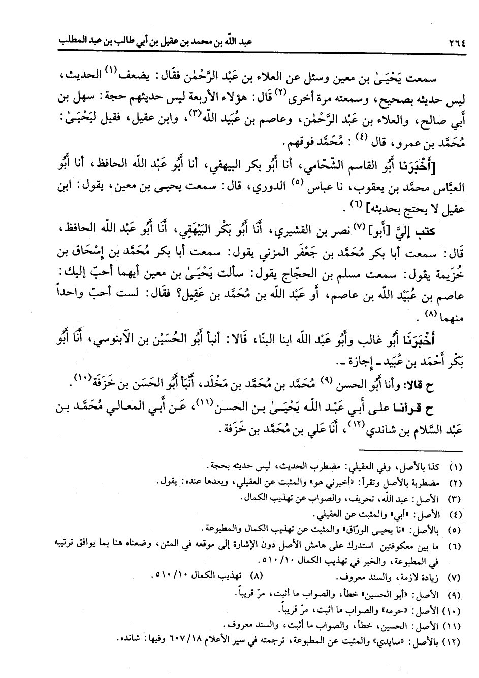 سمعت يحيى بن معين وسئل عن العلاء بن عبد الرحمن فقال يضعف (1) الحديث ليس حديثه بصحيح وسمعته مرة أخرى (2) قال هؤلاء الأربعة ليس حديثهم حجة سهل بن أبي صالح والعلاء بن عبد الرحمن وعاصم بن عبيد الله (3) وابن عقيل فقيل ليحيى محمد بن عمرو قال محمد (4) فوقهم أخبرنا أبو القاسم الشحامي أنا أبو بكر البيهقي أنا أبو عبد الله الحافظ أنا أبو العباس محمد بن يعقوب نا عباس (5) الدوري قال سمعت يحيى بن معين يقول ابن عقيل لا يحتج بحديثه (6) كتب الي أبو (7) نصر بن القشري أنا أبو بكر البيهقي أنا أبو عبد الله الحافظ قال سمعت أبا بكر محمد بن جعفر المزني يقول سمعت أبا بكر محمد بن إسحاق بن خزيمة يقول سمعت مسلم بن الحجاج يقول سألت يحيى بن معين ايهما احب إليك أحب عاصم بن عبيد الله بن عاصم أو عبد الله بن عقيل فقال لست أحب واحدا منهما (8) أخبرنا أبو غالب وأبو عبد الله ابنا البنا قالا أنبأ أبو الحسين بن الابنوسي أنا أبو بكر احمد بن عبيد إجازة ح قالا وأنا أبو الحسن (9) محمد بن محمد بن مخلد أنبأ أبو الحسن بن خزفة (10) ح قرانا على أبي عبد الله يحيى بن الحسن (11) عن أبي المعالي محمد بن عبد السلام بن شاندي (12) أنا علي بن محمد بن خزفة