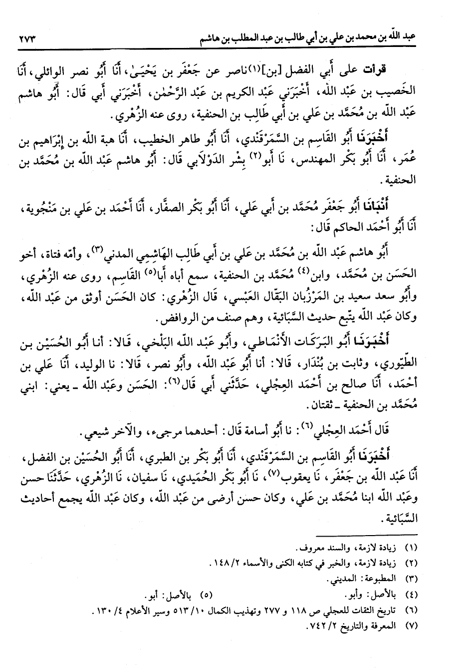 قرأت على أبي الفضل بن (1) ناصر عن جعفر بن يحيى أنا أبو نصر الوائلي أنا الخصيب بن عبد الله اخبرني عبد الكريم بن عبد الرحمن اخبرني أبي قال أبو هاشم عبد الله بن محمد بن علي بن أبي طالب بن الحنفية روى عنه الزهري أخبرنا أبو القاسم بن السمرقندي أنا أبو طاهر الخطيب أنا هبة الله بن إبراهيم بن عمر أنا أبو بكر المهندس نا أبو (2) بشر الدولابي قال أبو هاشم عبد الله بن محمد بن الحنيفة أنبأنا أبو جعفر محمد بن أبي علي أنا أبو بكر الصفار أنا أحمد بن علي بن منجوية أنا أبو أحمد الحاكم قال أبو هاشم عبد الله بن محمد بن علي بن أبي طالب الهاشمي المدني (3) وأمه فتاة أخو الحسن بن محمد وابن (4) محمد بن الحنفية سمع أباه أبا (5) القاسم روى عنه الزهير وأبو سعد سعيد بن المرزبان البقال العبسي قال الزهري كان الحسن أوثق من عبد الله وكان عبد الله يتبع حديث السبائية وهم صنف من الروافض أخبرنا أبو البركات الانماطي وأبو عبد الله البلخي قالا أنا أبو الحسين بن الطيوري وثابت بن بندار قالا أنا أبو عبد الله وأبو نصر قالا نا الوليد أنا علي بن أحمد أن صالح بن احمد العجلي حدثني أبي قال الحسن وعبد الله يعني ابني محمد بن الحنفية ثقتان قال احمد العجلي (6) نا أبو أسامة قال أحدهما مرجئ والآخر شيعي أخبرنا أبو القاسم بن السمرقندي أنا أبو بكر بن الطبري أنا أبو الحسين بن الفضل أنا عبد الله بن جعفر نا يعقوب (7) نا أبو بكر الحميدي نا سفيان نا الزهري حدثنا حسن وعبد الله ابنا محمد بن علي وكان حسن أرضى من عبد الله وكان عبد الله يجمع أحاديث السبائية