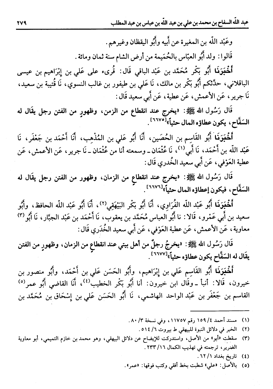 أخبرنا أبو عبد الفراوي أنا أبو بكر البهيقي (2) أنا عبد الله الحافظ وأبو سعيد بن أبي عمرو قالا نا أبو العباس محمد بن يعقوب نا احمد بن عبد الجبار نا أبو (3) معاوية عن الأعمش عن عطية العوفي عن أبي سعيد الخدري قال قال رسول الله (صلى الله عليه وسلم) يخرج رجل من وأهل بيتي عند انقطاع من الزمان وظهور من الفتن رجل يقال له السفاح يكون عطاؤه حثيا