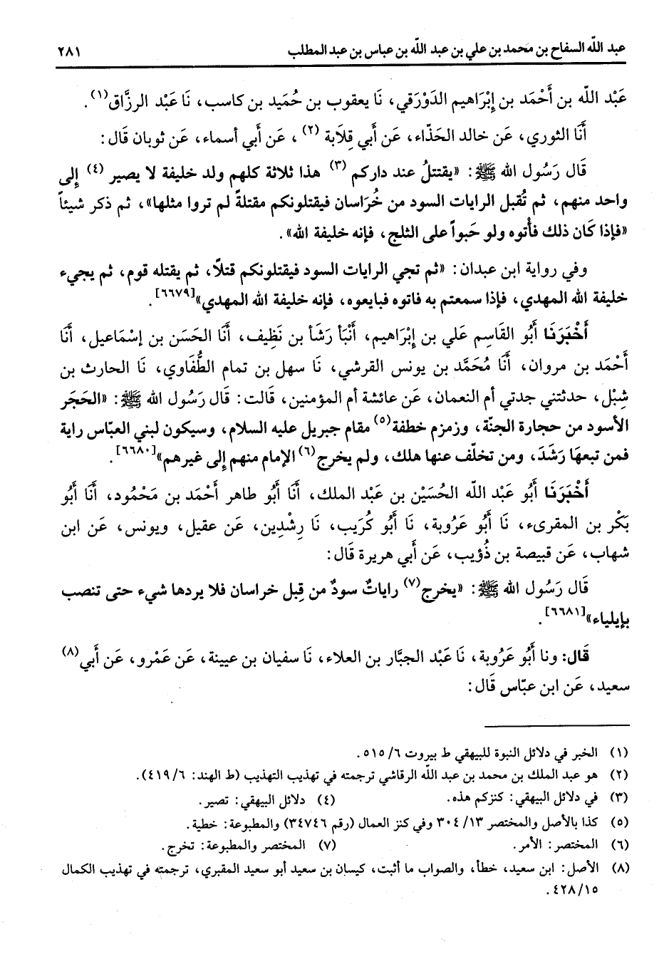 عبد الله بن احمد بن إبراهيم الدورقي نا يعقوب بن حميد بن كاسب نا عبد الرزاق (1) أنا الثوري عن خالد الحذاء عن أبي قلابة (2) عن أبي أسماء عن ثوبان قال قال رسول الله (صلى الله عليه وسلم) يقتتل عند داركم (3) هذا ثلاثة كلهم ولد خليفة لا يصير (4) إلى واحد منهم ثم تقبل الرايات السود من خراسان مقتلة لم تروا مثلها ثم ذكر شيئا فإذا كان ذلك فأتوه ولو حبوا على الثلج فانه خليفة الله وفي رواية ابن عبدان ثم تجئ الرايات السود فيقتلونكم قتلا ثم يقتله قوم ثم يجئ خليفة الله المهدي فإذا سمعتم بن فاتوه فبايعوه فانه خليفة الله المهدي