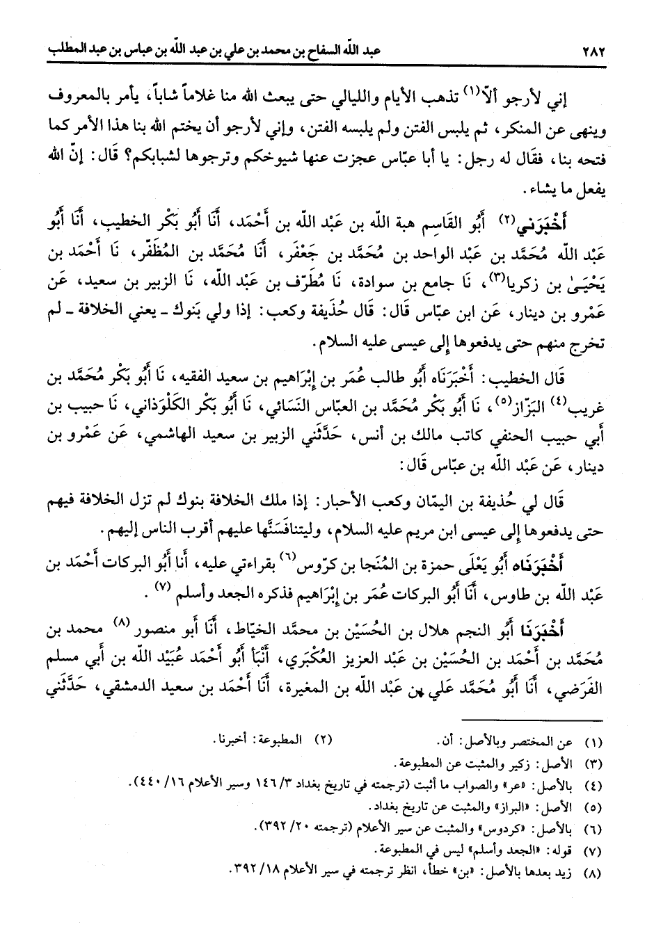 أني لأرجو (1) إلا تذهب الأيام والليالي حتى يبعث الله منا غلاما شابا يأمر بالمعروف وينهى عن المنكر ثم يلبس الفتن ولم يلبسه الفتن وأني لأرجو أن يختم الله بنا هذا الأمر كما فتحه بنا فقال له رجل يا أبا عباس عجزت عنها شيوخكم وترجوها لشبابكم قال إن الله يفعل ما يشاء أخبرني (2) أبو القاسم هبة الله بن عبد الله بن احمد أنا أبو بكر الخطيب أنا أبو عبد الله محمد بن عبد الواحد بن محمد بن جعفر أنا محمد بن المظفر نا احمد بن يحيى بن زكريا (3) نا جامع بن سوادة نا مطرف بن عبد الله نا الزبير بن سعيد عن عمرو بن دينار عن ابن عباس قال قال حذيفة وكعب إذا ولي بنوك يعني الخلافة لم تخرج منهم حتى يدفعوها إلى عيسى عليه السلام قال الخطيب أخبرناه أبو طالب عمر بن إبراهيم بن سعيد الفقيه نا أبو بكر محمد بن غريب (4) البزاز (5) نا أبو بكر محمد بن العباس النسائي نا أبو بكر الكولذاني نا حبيب بن أبي حبيب الحنفي كاتب مالك بن انس حدثني الزبير بن سعيد الهاشمي عن عمرو بن دينار عن عبد الله بن عباس قال قال لي حذيفة بن اليمان وكعب الأحبار إذا ملك الخلافة بنوك لم تزل الخلافة فيهم حتي يدفعوها إلى عيسى ابن مريم عليه السلام وليتنافسنها عليهم اقرب الناس إليهم أخبرناه أبو يعلى حمزة بن المنجا بن كروس (6) بقراءتي عليه أنا أبو البركات احمد بن عبد الله بن طاوس أنا أبو البركات عمر بن إبراهيم فذكره الجعد واسلم (7) أخبرنا أبو النجم هلال بن الحسين بن محمد الخياط أنا أبو منصور (8) محمد بن محمد بن احمد بن الحسين بن عبد العزيز العكبري أنبأ أبو احمد عبيد الله بن أبي مسلم الفرضي أنا أبو محمد علي بن عبد الله بن المغيرة أنا احمد بن سعيد الدمشقي حدثني