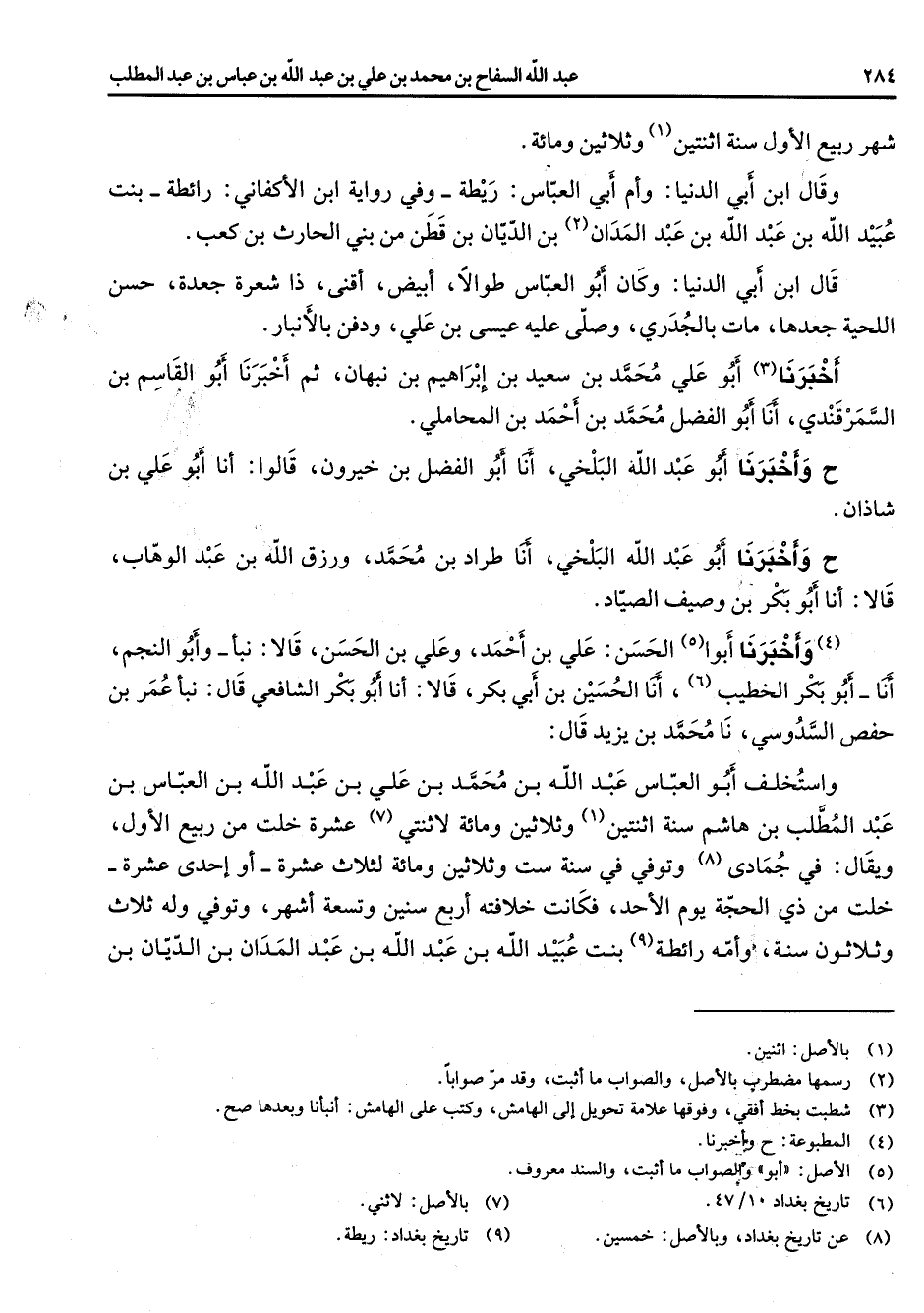 شهر ربيع الأول سنة اثنتين (1) وثلاثين ومائة وقال ابن أبي الدنيا وأم العباس ريطة وفي رواية ابن الأكفاني رائطة بنت عبيد الله بن عبد الله بن عبد المدان (2) بن الديان بن قطن من بني الحارث بن كعب قال ابن أبي الدنيا وكان أبو العباس طوالا ابيض اقنى ذا شعره جعدة حسن اللحية جعدها مات بالجدري وصلى عليه عيسى بن علي ودفن بالأنبار أخبرنا (3) أبو علي محمد بن سعيد بن إبراهيم بن نبهان ثم أخبرنا أبو القاسم بن السمرقندي أنا أبو الفضل محمد بن احمد بن المحاملي ح وأخبرنا أبو عبد الله البلخي أنا أبو الفضل بن خيرون قالوا أنا أبو علي بن شاذان ح وأخبرنا أبو عبد الله البلخي أنا طراد بن محمد ورزق الله بن عبد الوهاب قالا أنا أبو بكر بن وصيف الصياد (4) وأخبرنا أبو (5) الحسن علي بن احمد وعلي بن الحسن قالا نبأ وأبو النجم أنا أبو بكر الخطيب (6) أنا الحسين بن أبي بكر قالا أنا أبو بكر الشافعي قال نبأ عمر بن حفص السدوسي نا محمد بن يزيد قال واستخلف أبو العباس عبد الله بن محمد بن علي بن عبد الله بن العباس بن عبد المطلب بن هاشم سنة اثنتين (1) وثلاثين ومائة لاثنتي (7) عشرة خلت من ربيع الأول ويقال في جمادى (8) وتوفي في سنة ست وثلاثين ومائة لثلاث عشرة أو إحدى عشرة خلت من ذي الحجة يوم الأحد فكانت خلافته أربع سنين وتسعة اشهر وتوفي وله ثلاث وثلاثون سنة وأمه رائطة (9) بنت عبيد الله بن عبد الله بن عبد المدان بن الديان بن